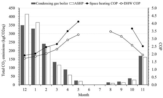Monthly CO2eq emissions from ASHP and a condensing gas boiler system (2024 baseline).