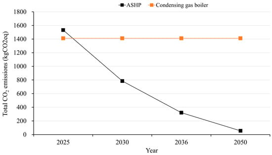 Figure 14 presents the comparative CO2 emissions of the ASHP and a condensing gas boiler under each scenario. The baseline analysis (2024) shows that ASHPs currently emit more CO2 than condensing gas boilers due to both degraded winter performance and the higher emission intensity of electricity. However, as the grid becomes cleaner: