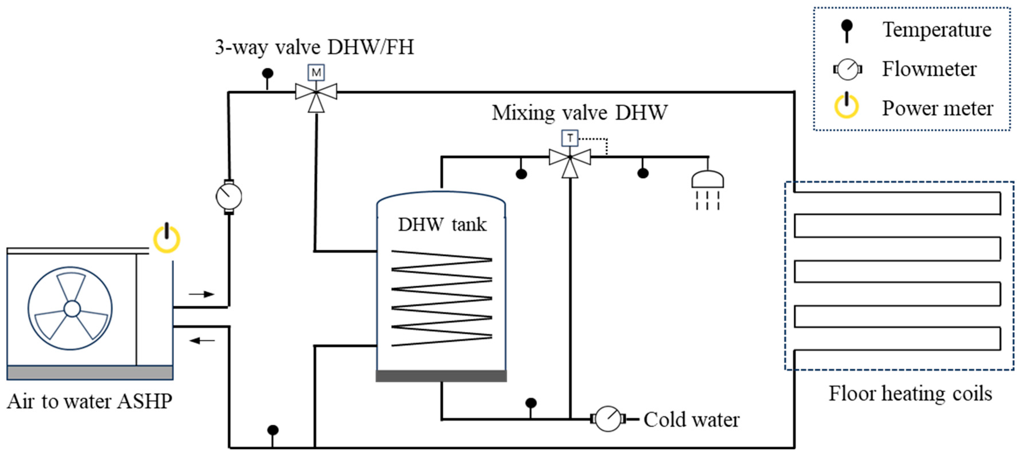 - Wu, P.; Wang, Z.; Li, X.; Xu, Z.; Yang, Y.; Yang, Q. Energy-saving analysis of air source heat pump integrated with a water storage tank for heating applications. Build. Environ. 2020, 180, 107029. [Google Scholar] [CrossRef]