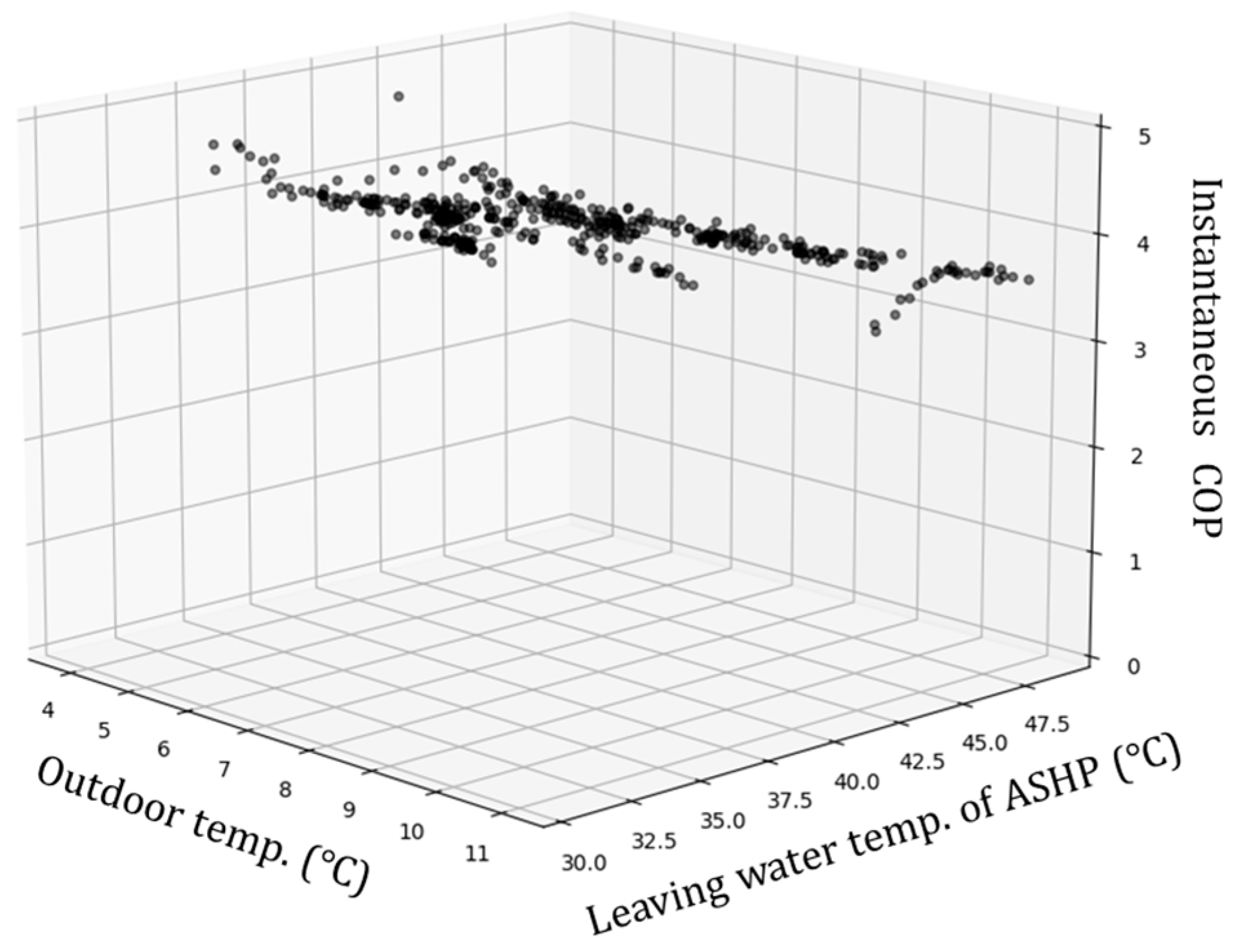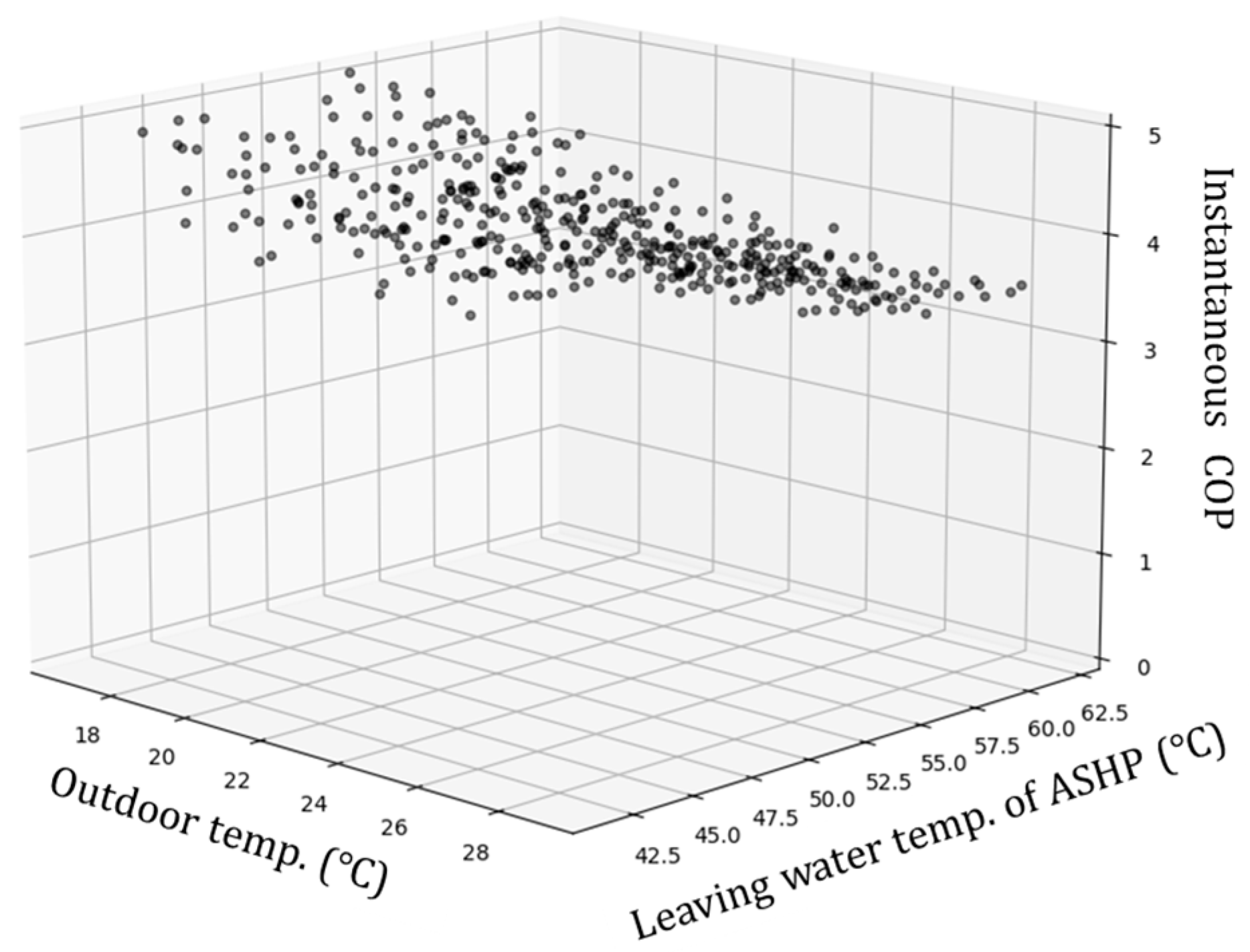 - To develop a manufacturer-based COP prediction model using bi-quadratic regression derived from catalog data, and to quantify the performance gap between rated and in situ operation through statistical validation of more than 7100 paired data samples.