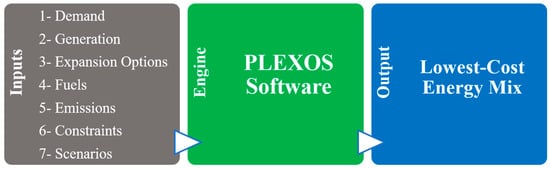 In order to determine the lowest-cost energy mix in the country, it is essential to apply a deterministic programming methodology that is capable of simulating multiple scenarios at varying conditions. This approach was used to co-optimize both a clean and non-clean power generation portfolio to develop a strategic plan for the city, without compromising the economic advantages and production costs of the overall system. In this project, PLEXOS® energy modelling software (Version 9.20.0001) served as the primary tool for determining the most cost-effective capacity expansions, utilizing an optimization-based technique at the backend [38]. It is a widely recognized and reliable energy modelling tool used in the industry for long-term expansion planning. Its results have been validated in numerous studies and real-world applications [10,23,35,39], which demonstrates its accuracy in optimizing power systems, forecasting demand, and evaluating economic and environmental trade-offs. Decision-makers, utility governmental authorities, and researchers rely on PLEXOS® to develop data-driven strategies that ensure efficient resource allocation, grid stability, and sustainable energy transitions. Its proven track record makes it a trusted tool for informed policy and investment decisions in the energy sector.