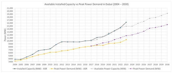 This data-driven study relied on DEWA’s Annual Statistical Reports (ASR) and the Sustainability Report (2017) as its primary sources, utilizing both actual and predicted data of installed capacity and peak demand. The statistical reports encompass actual data on installed capacity and peak demands, extracted for the years 2004 to 2023, as shown using solid lines in Figure 4 [25]. The Sustainability Report, produced in 2017, indicated an anticipated trend from 2017 to 2030 (dashed lines), in alignment with the actual data from 2004 to 2023, making it a reliable resource for future years’ predictions [43].