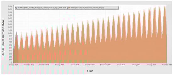 Base year (2023) and forecasted power demand (MW) (2024–2052) in Dubai using PLEXOS®.