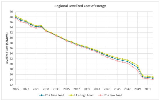 The capacity factor trend was examined based on the NREL Annual Technology Baseline (ATB) [53]. Predictions for capacity factors were developed for various categories spanning from 2021 to 2050, considering technological advancements over time. For PV plants, a lower limit of 26.2% was applied across all categories, existing, planned, and expansion candidates, according to the 2022 installed capacity and energy generation [44,59]. However, upper limits were derived from NREL projections, which anticipate three values corresponding to the three scenarios: advanced, moderate, and existing. These upper limits were utilized for the expansion, planned, and existing categories, reflecting the anticipated technological improvements for future expansions until 2050, compared to planned candidates and expansion candidates up to 2030, which are expected to come online in the next few years. Finally, a narrower range of capacity factor was taken for existing candidates.