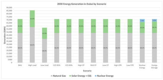 The model addressed multiple limitations to regulate expansion and align with regulations and energy strategies, including the UAE’s net-zero energy plan for 2050. These constraints are configured within PLEXOS® to prevent exceeding defined limits, track renewables penetration, and ensure seamless ESS integration. Moreover, various scenarios were established to evaluate parameters’ impacts on mid- and long-term outcomes, ensuring compliance with constraints like CO2 emissions and testing different carbon price (CP) values. Table 4 summarizes key scenarios considered in this study. To account for variations in demand relative to the base load, two load scenarios were evaluated with ±20% variation with respect to the base load shown in Figure 7. In addition, two commonly used CCS efficiencies were included to assess their techno-commercial implications on the expansion plan. Three different carbon-pricing levels were also examined to understand their potential impact on expansion economics. CO2 production rates were varied under high and low scenarios to reflect potential fluctuations in emissions. The analysis incorporated the potential role of nuclear energy and energy storage solutions, in line with DEWA’s official strategic expansion plans [18].