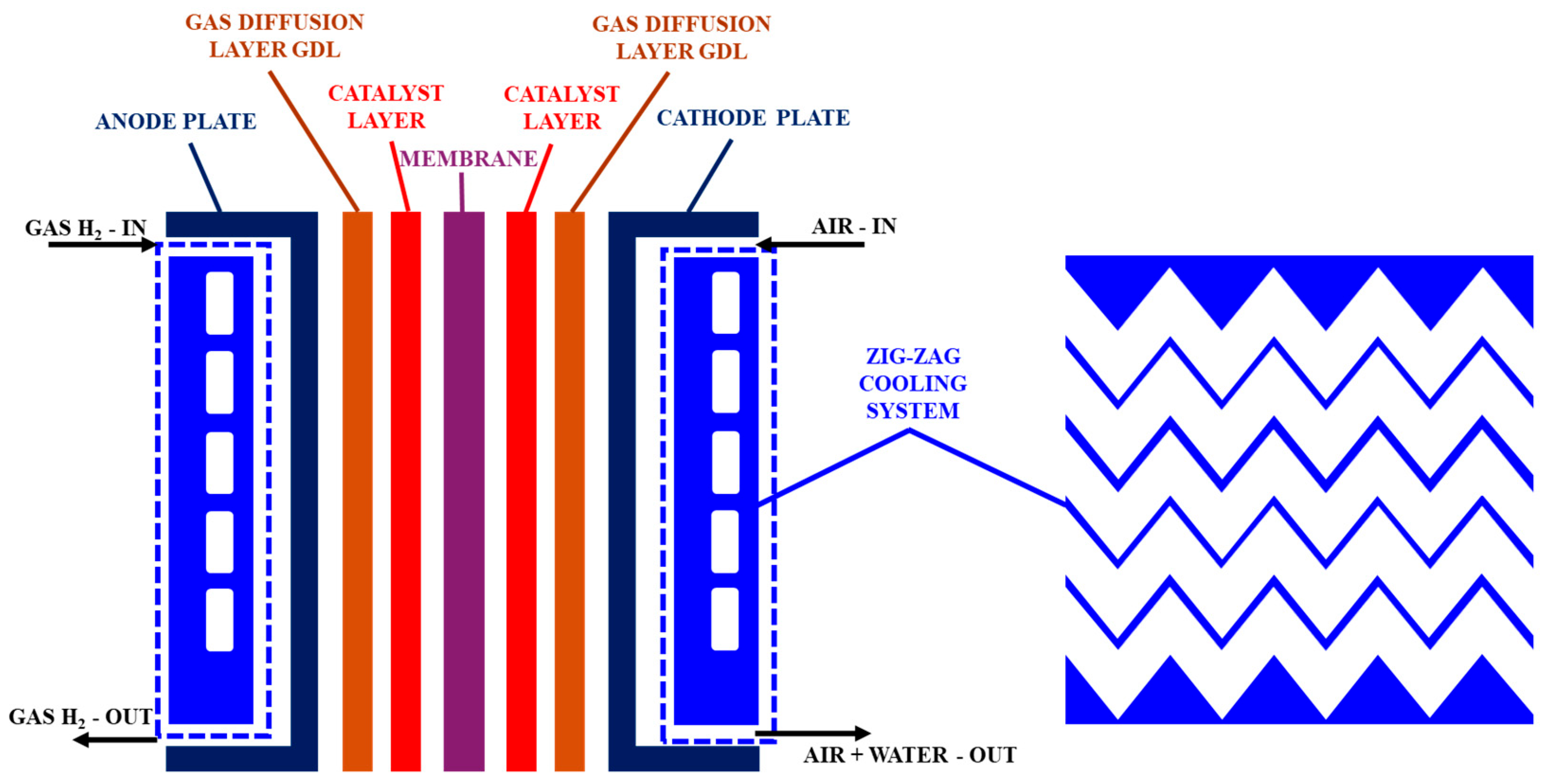 Iskandarianto, F.A.; Ichsani, D.; Taufany, F. Thermal–Fluid Behavior and Heat-Transfer Enhancement in PEMFC Cooling Plates Using Multi-Fin Zigzag Channels Under Variable Slope Angles. Energies 2026, 19, 174. https://doi.org/10.3390/en19010174