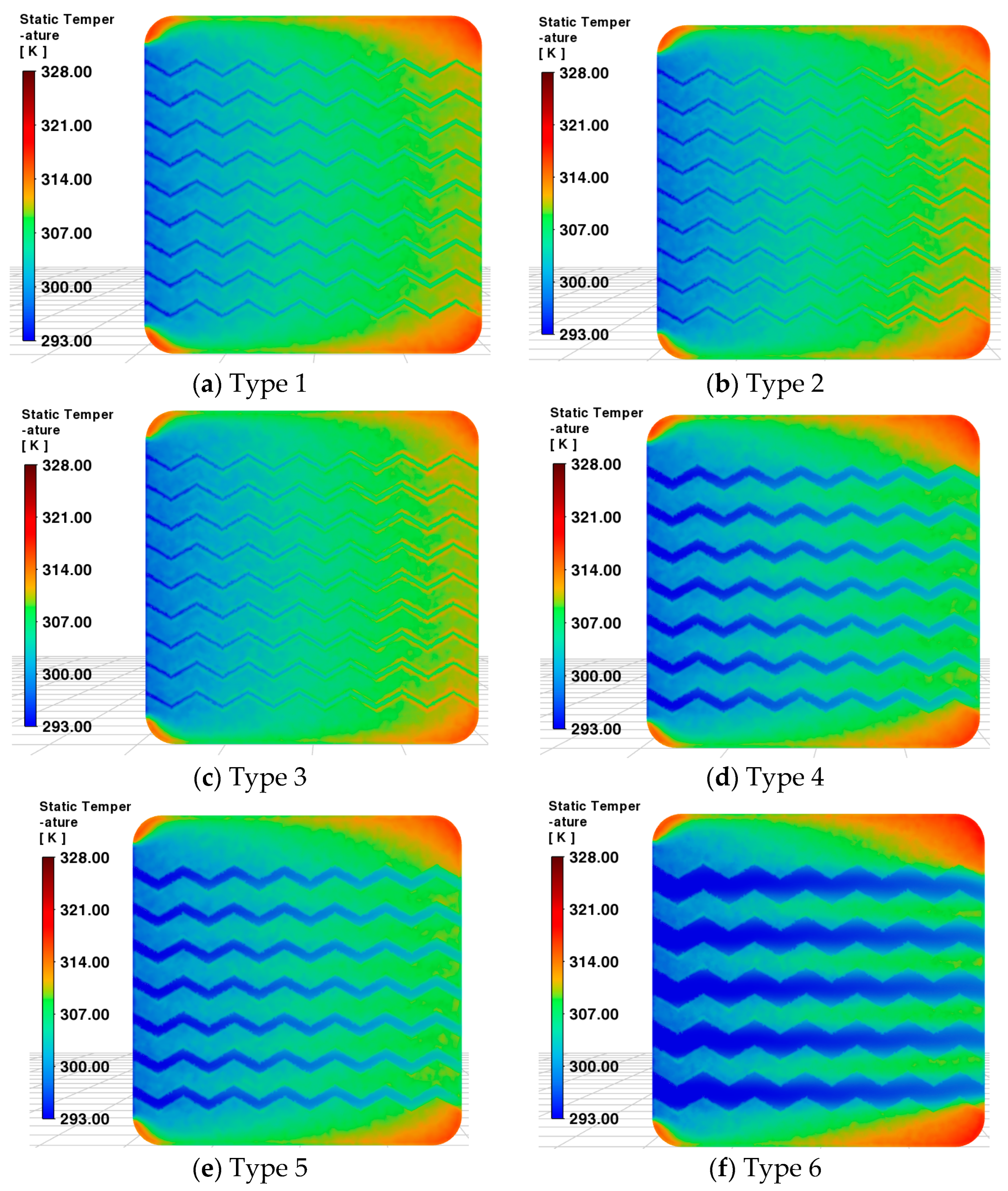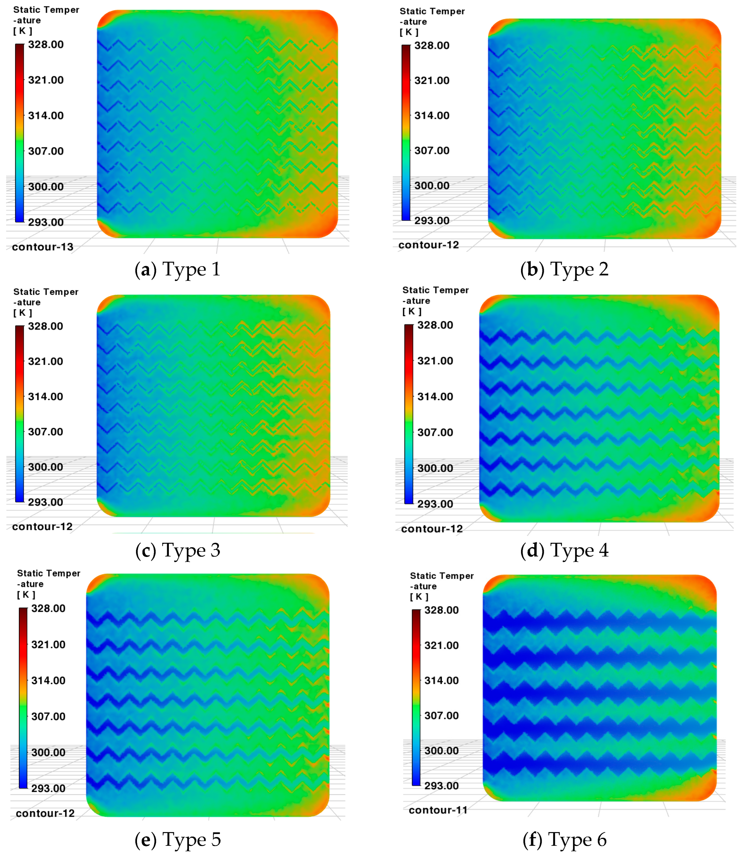 - Complex zigzag configurations gradually reproduced lower and more homogeneous temperature distributions in the cooling plate. This uniformity suppressed the formation of hot spots, which were responsible for stable PEMFC operation. Types 5 and 6 represented the most gradual temperature decline in all slope angles.