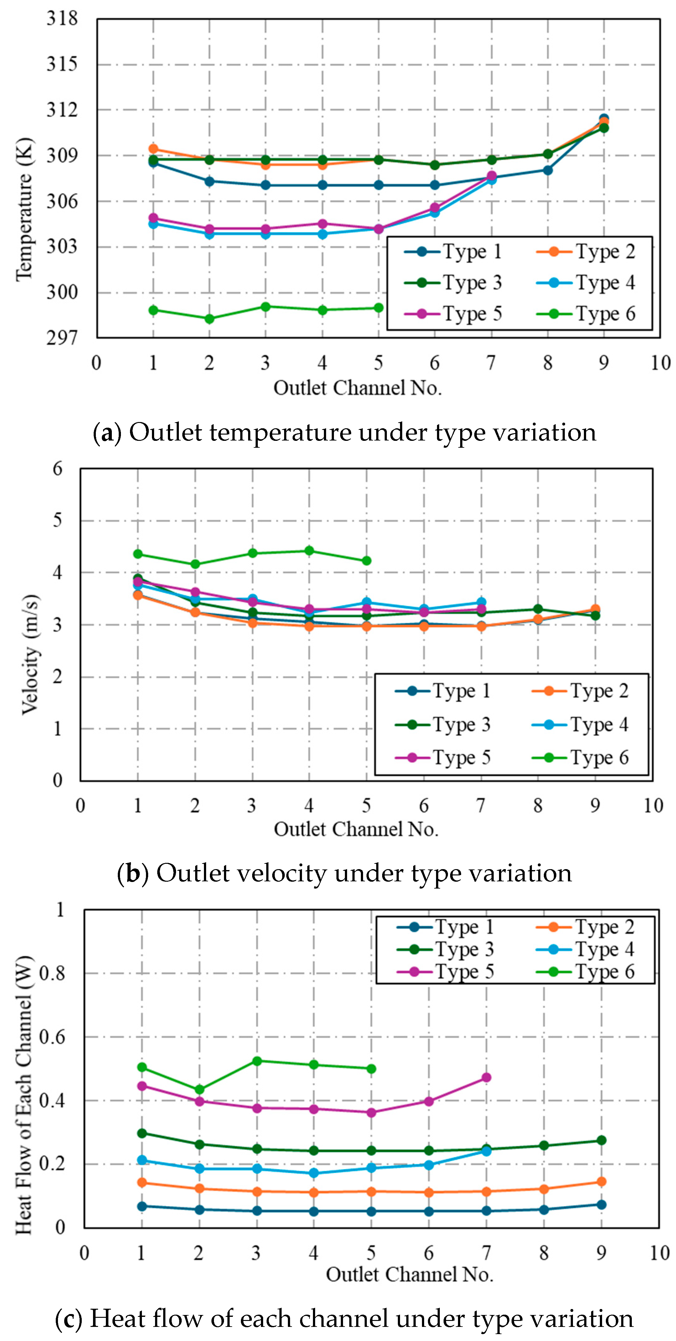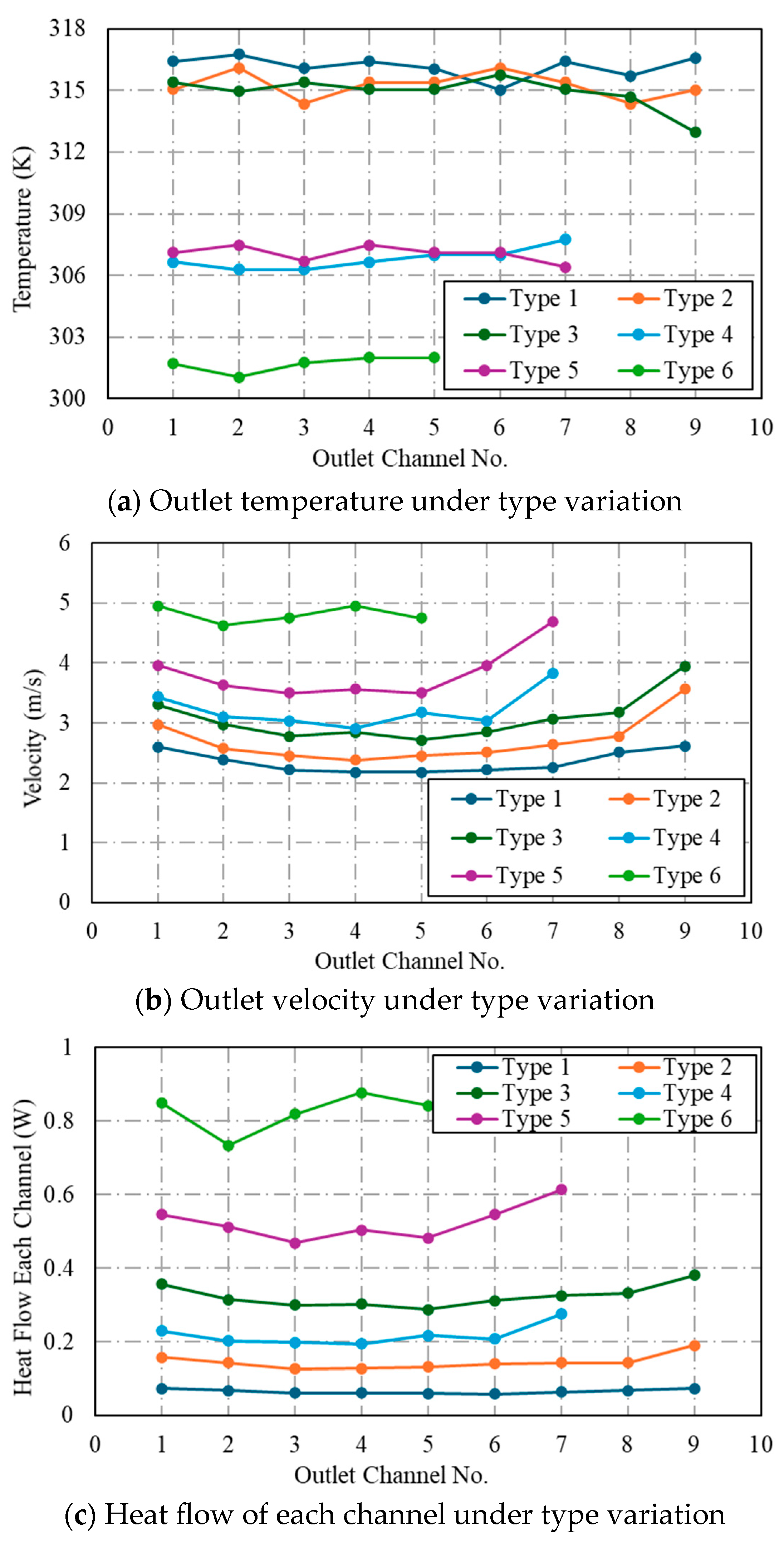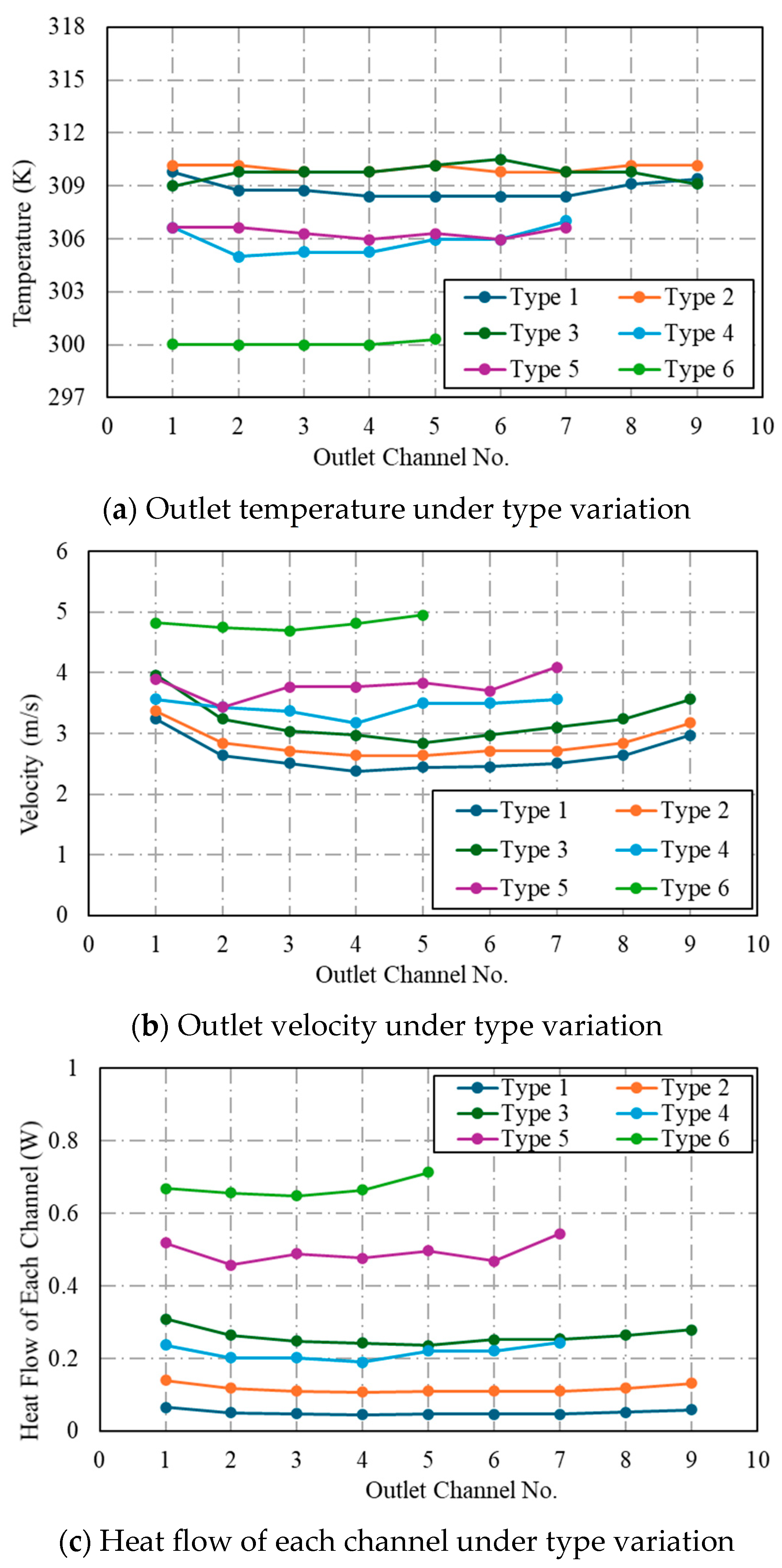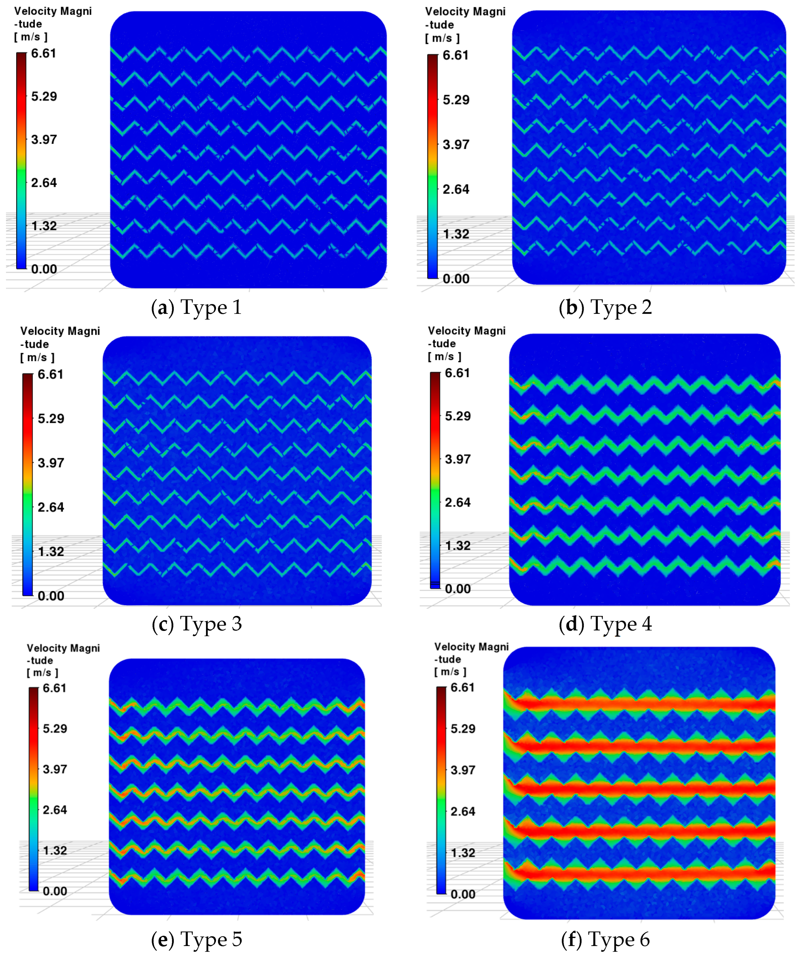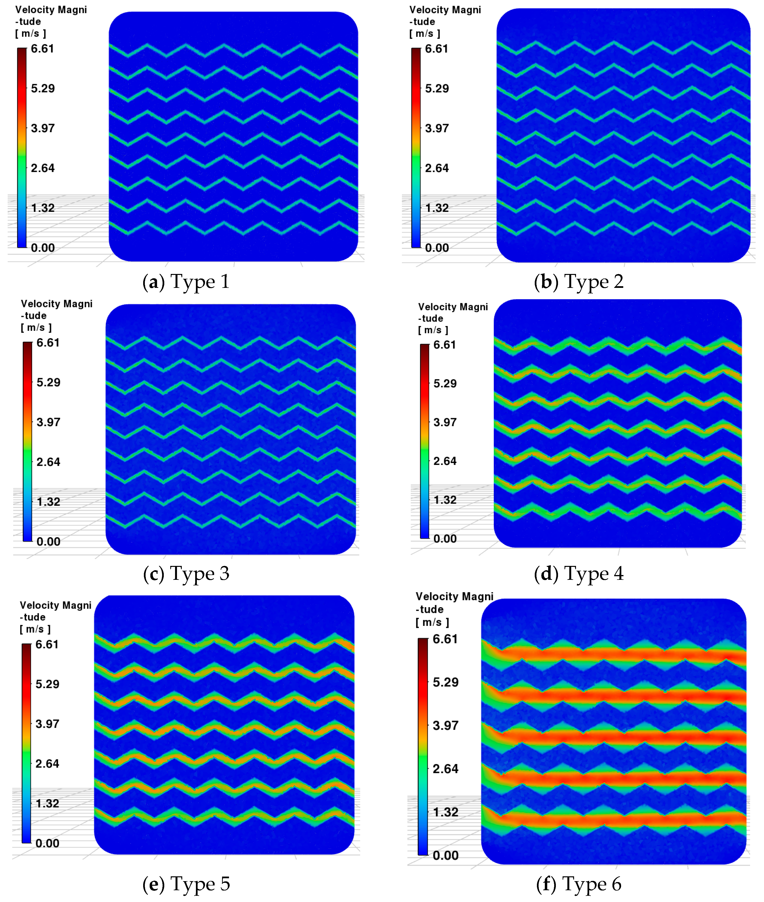 - Sharper zigzag paths triggered occasional coolant redirection, which led to maximum velocities and intensified secondary flow structures. The flow patterns triggered internal mixing and lowered stagnant regions in the channels. Type 6 layout exhibited the strongest capability for accelerating coolant flow.