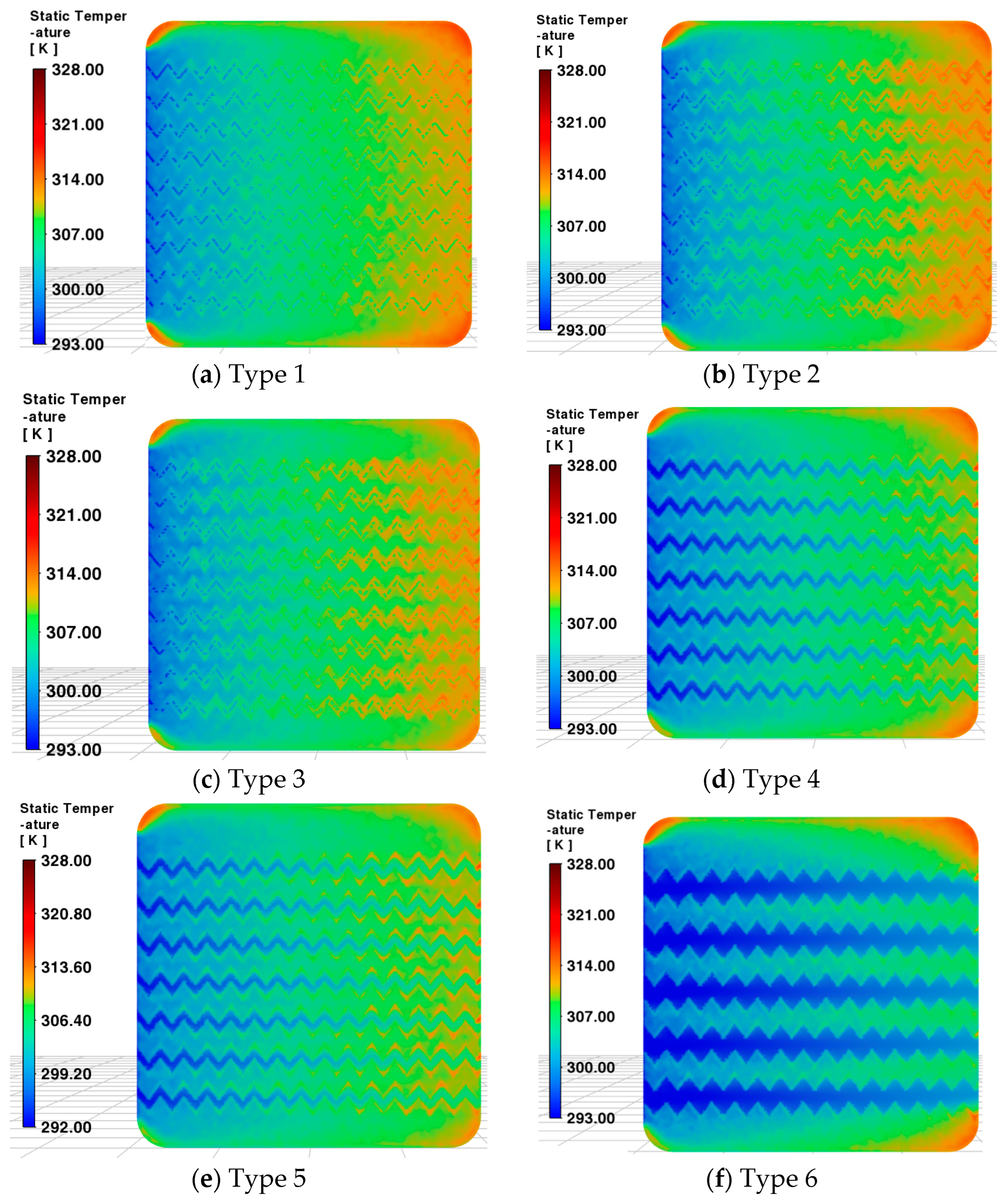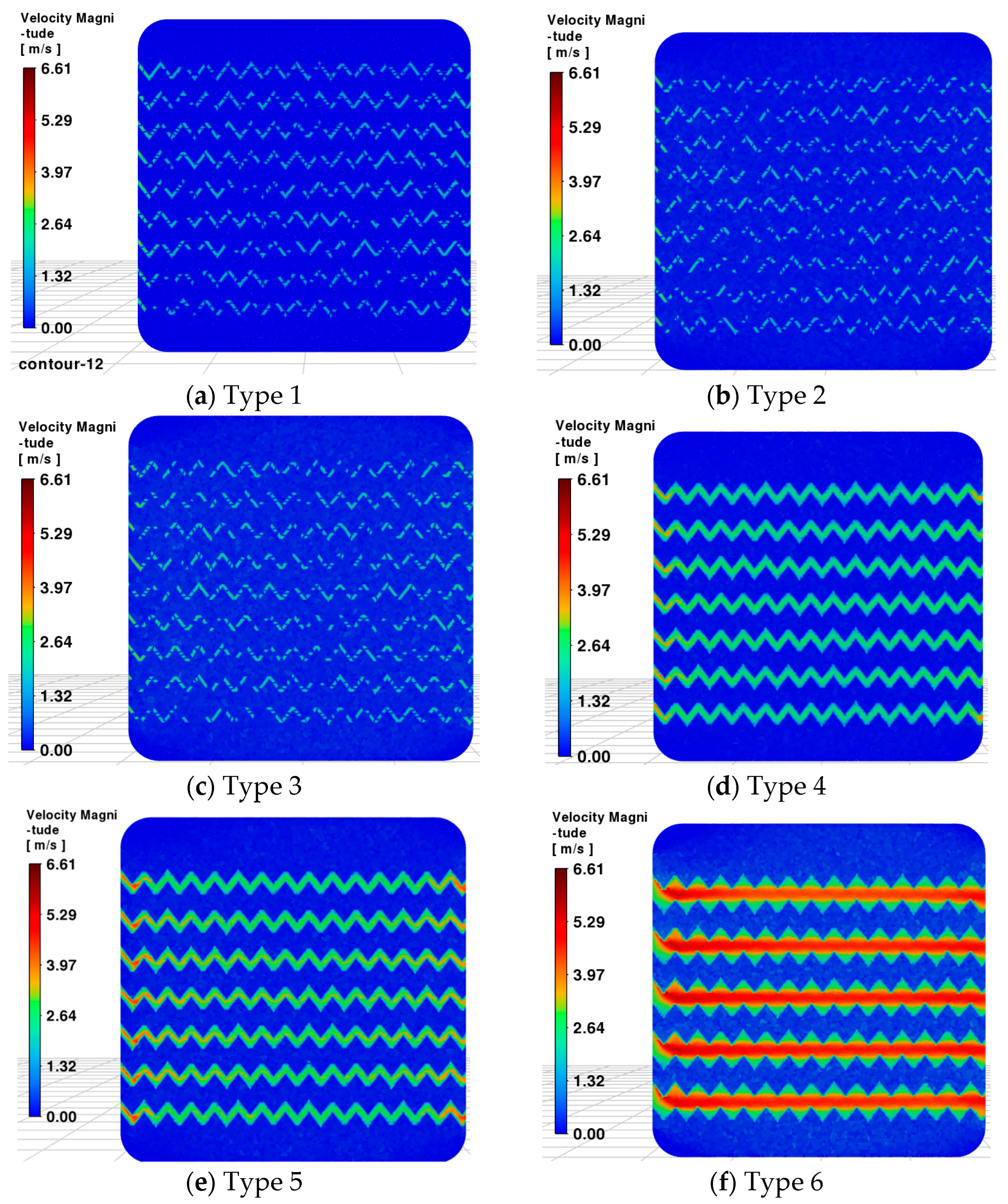 | Type 6 | a = 4, b = 4, h = 2 | 75/90/120 | Lowest temperature but locally sensitive | Very high velocity, intense vortices | High heat transfer but increased pressure drops | High performance with higher hydraulic loss |