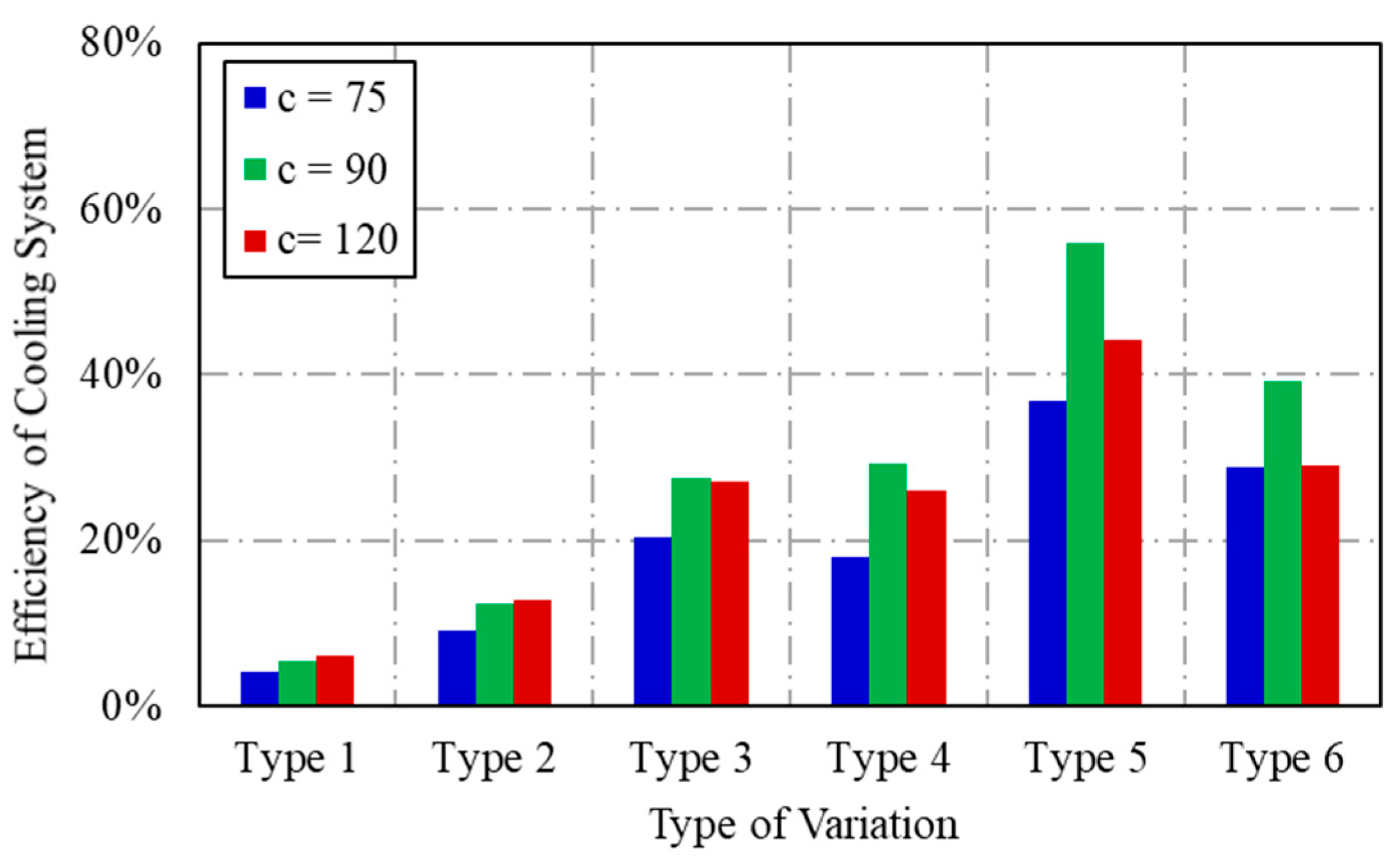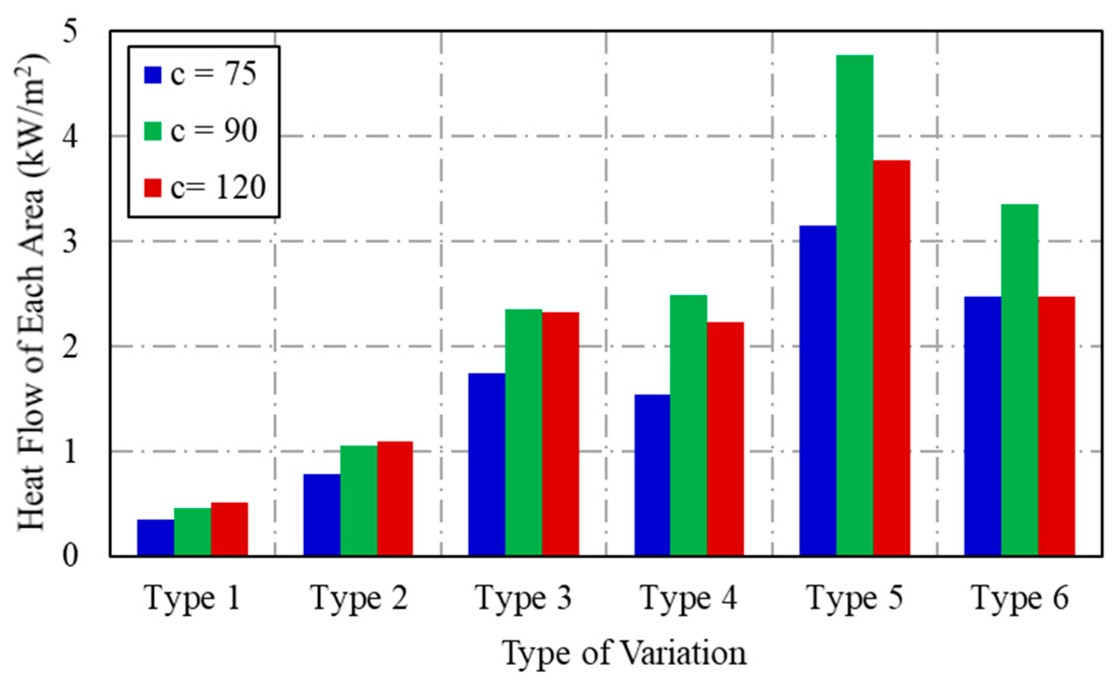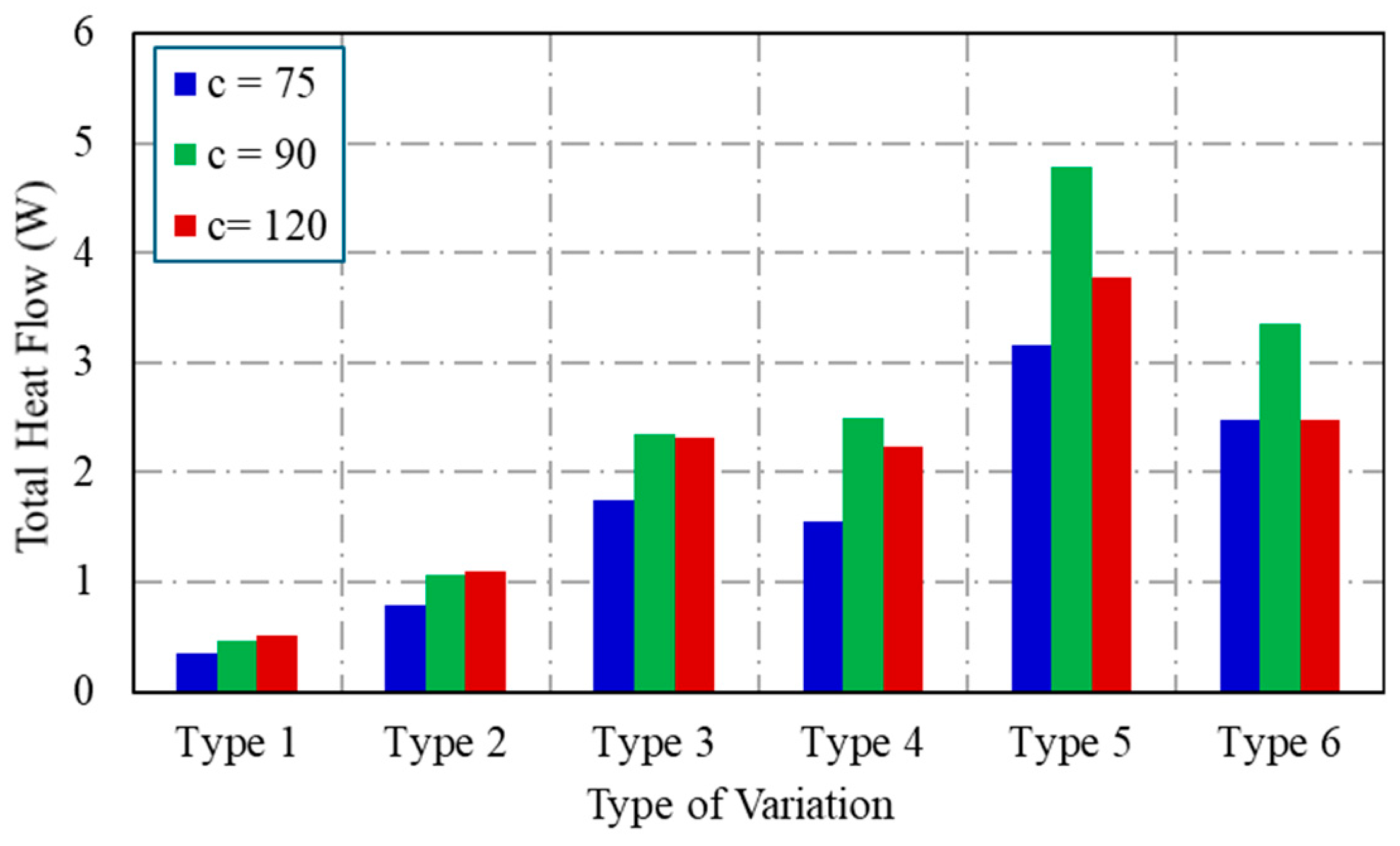 | Type 1 | a = 1, b = 1, h = 2 | 75/90/120 | Relatively high and non-uniform temperature | Low velocity, weak disturbance | Lowest heat flow and cooling efficiency | Least effective design |