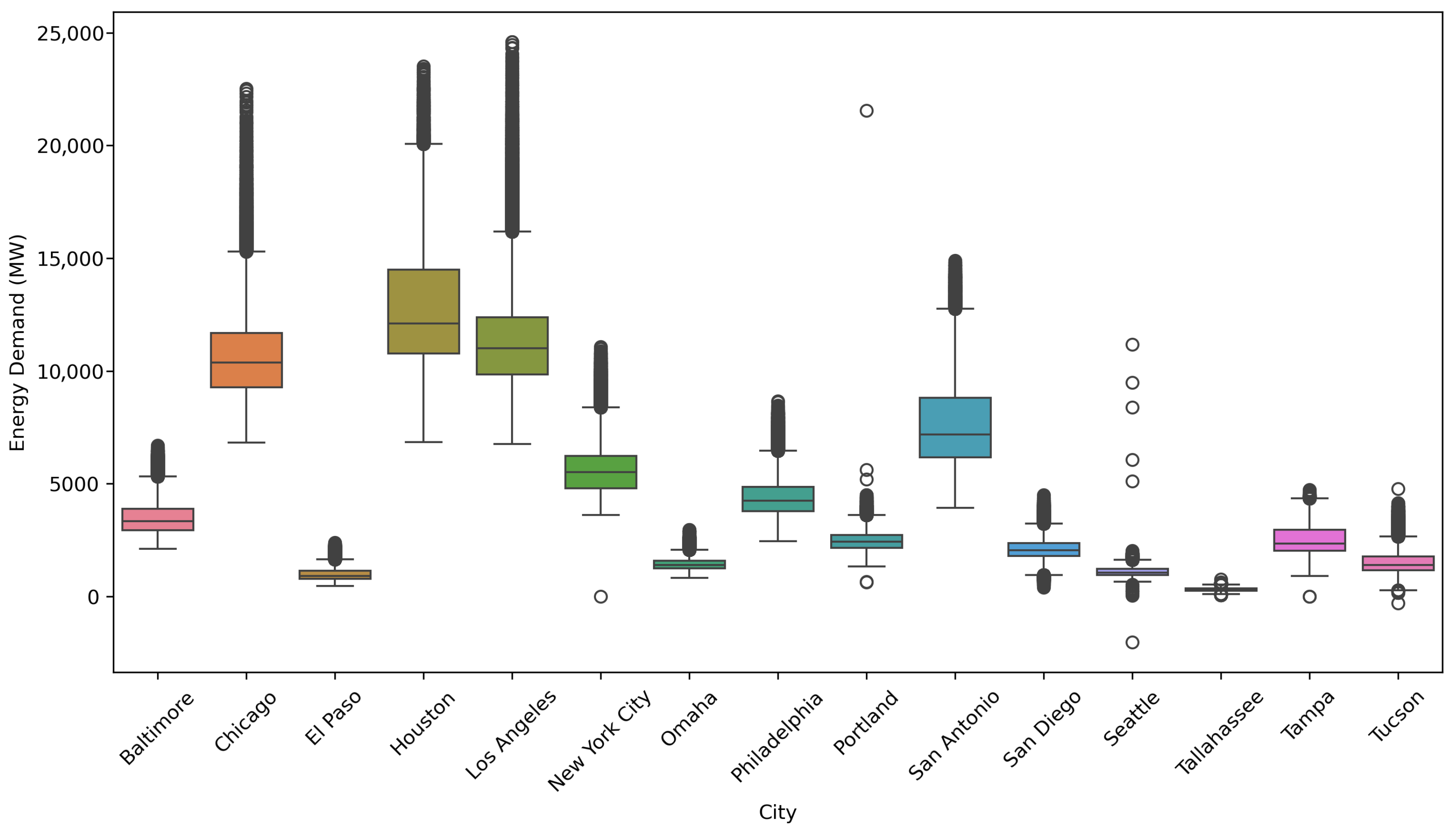 - Mean Absolute Percentage Error (MAPE): Measures the average percentage deviation of predicted values from actual observations, providing an interpretable scale-independent metric for comparing performance across cities with varying energy demand levels.