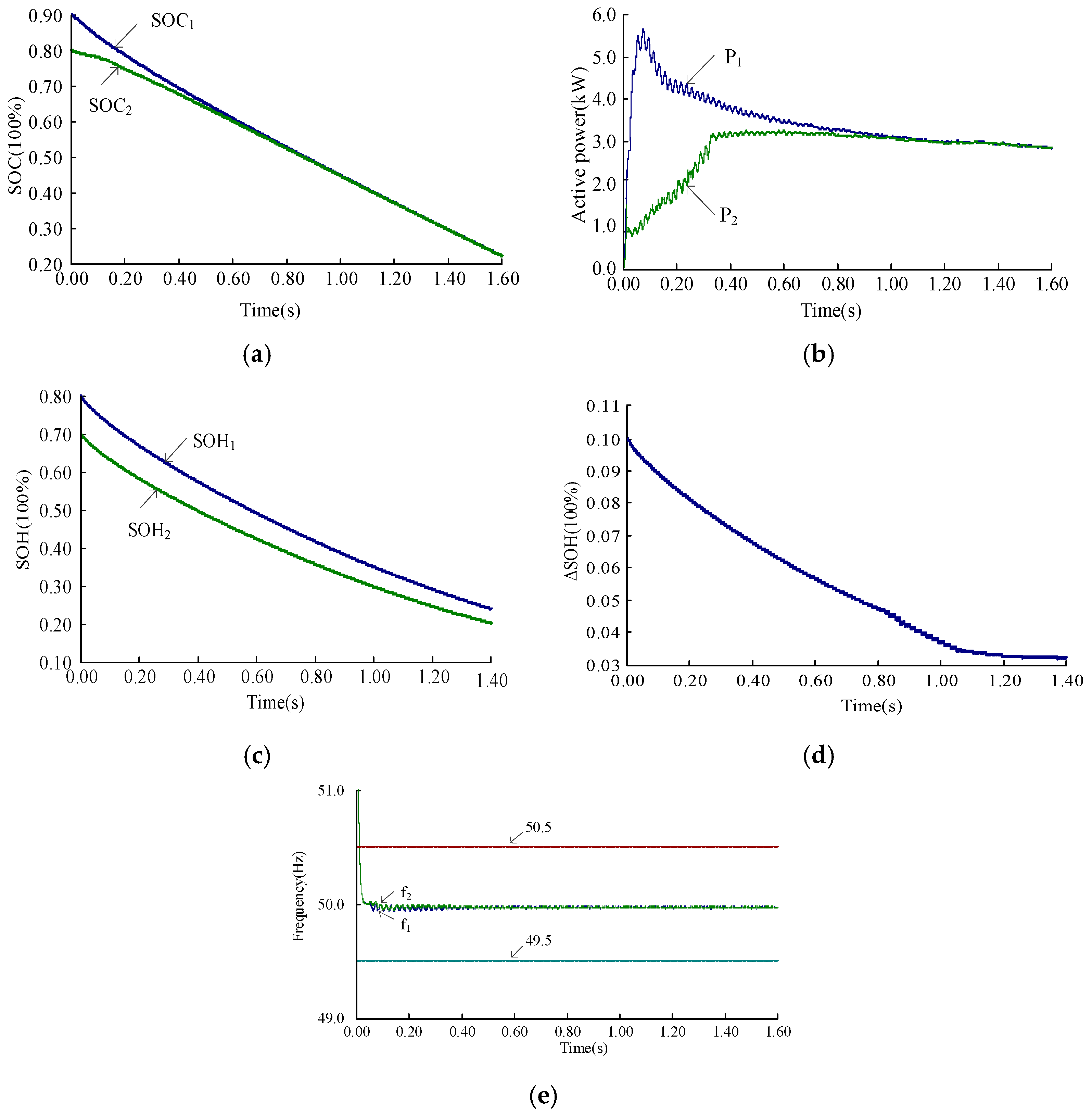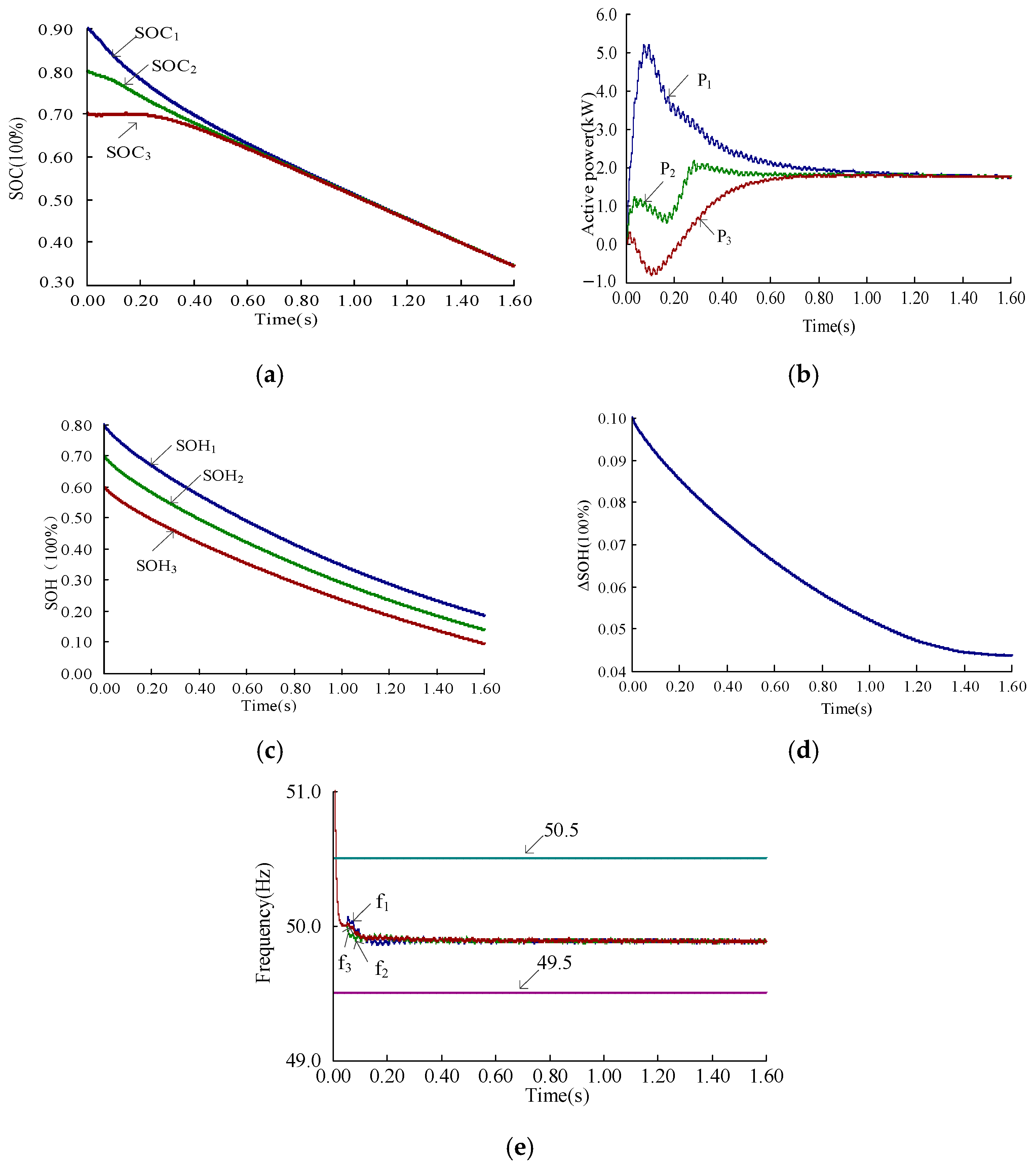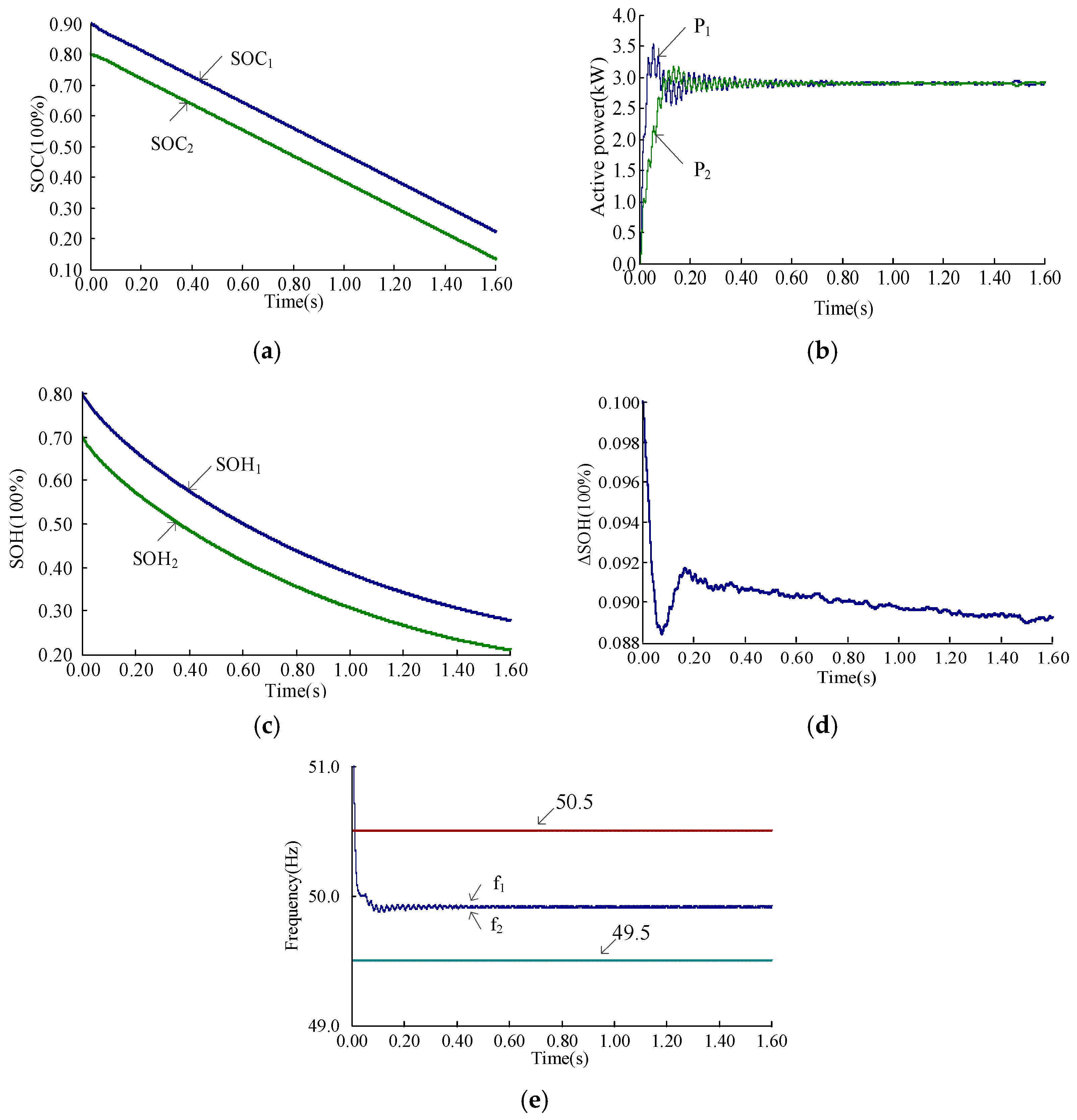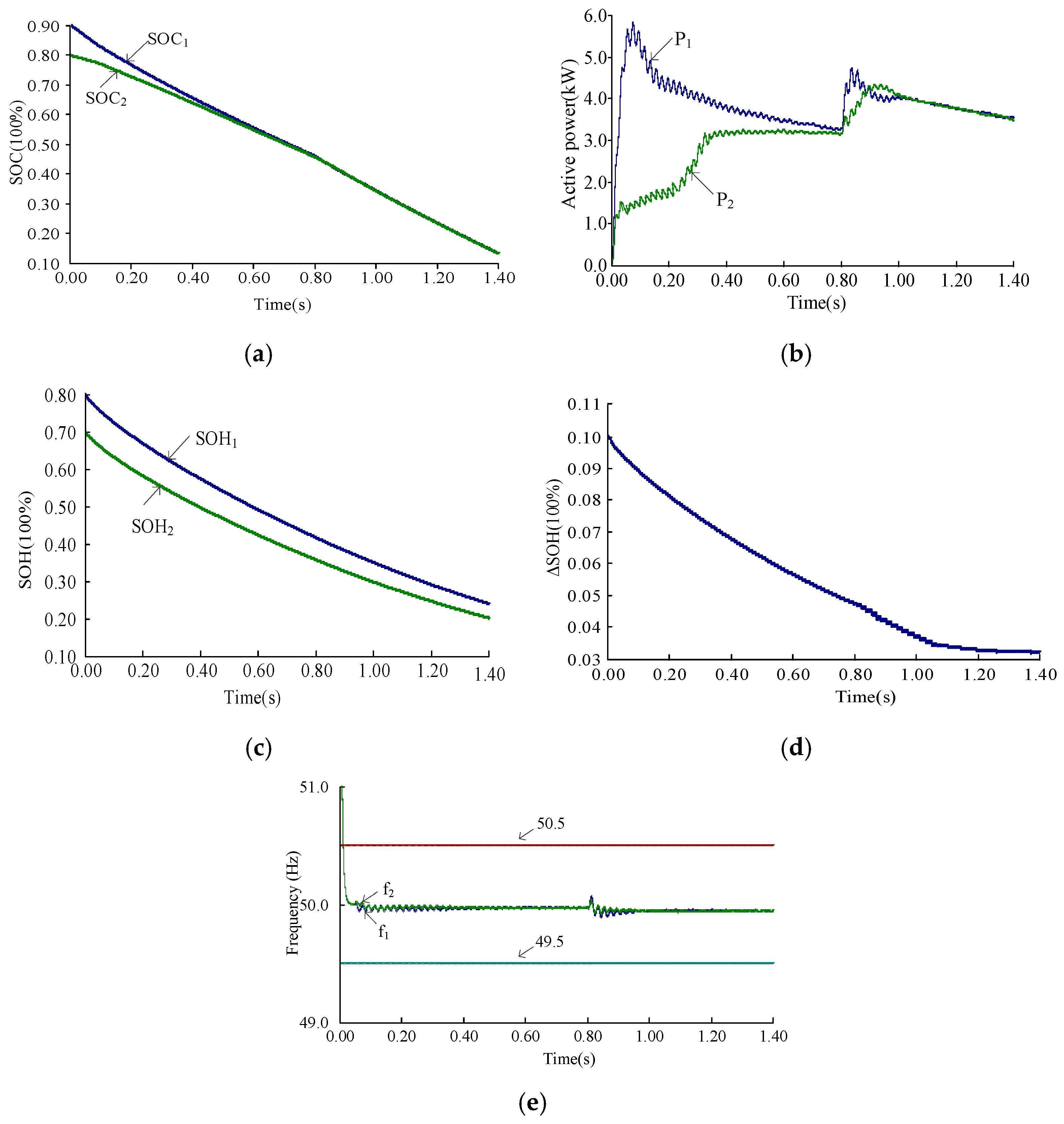- The proposed solution adjusts the active power of LBESS inverters based on the SOH and SOC states. It not only achieves SOC balancing but also reduces the SOH balancing errors, thereby overcoming the limitations associated with large SOH balancing discrepancies in traditional P-f droop control and SOC balancing strategies.