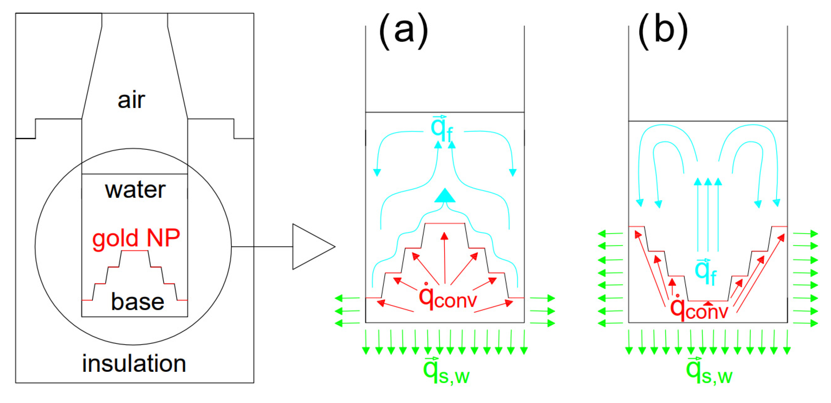 The objective of this study is to develop a chamber design that is sufficiently simple to enable the practical application of nanoparticles while simultaneously allowing efficient heat transfer to the water, with minimal heat losses to the surroundings. Figure 1a shows the primary concept of the germicidal chamber with a gradually ascending stepped heat source configuration (Case 1, namely: C1); on the other hand, Figure 1b describes a modified shape with a gradually descending configuration (Case 2, namely: C2). Additionally, Figure 1 presents the main components of the germicidal chamber with a schematic diagram illustrating the hypothesized flow patterns and heat transfer mechanisms in C1—Figure 1a and C2—Figure 1b. On gold NP, electromagnetic waves are converted into heat ( q ˙ c o n v —red arrows), which is subsequently conducted through the base structure to an insulated container ( q s , w —green arrows) filled with water ( q f —blue arrows) to test the performance of the device. An air layer is present above the water surface.
