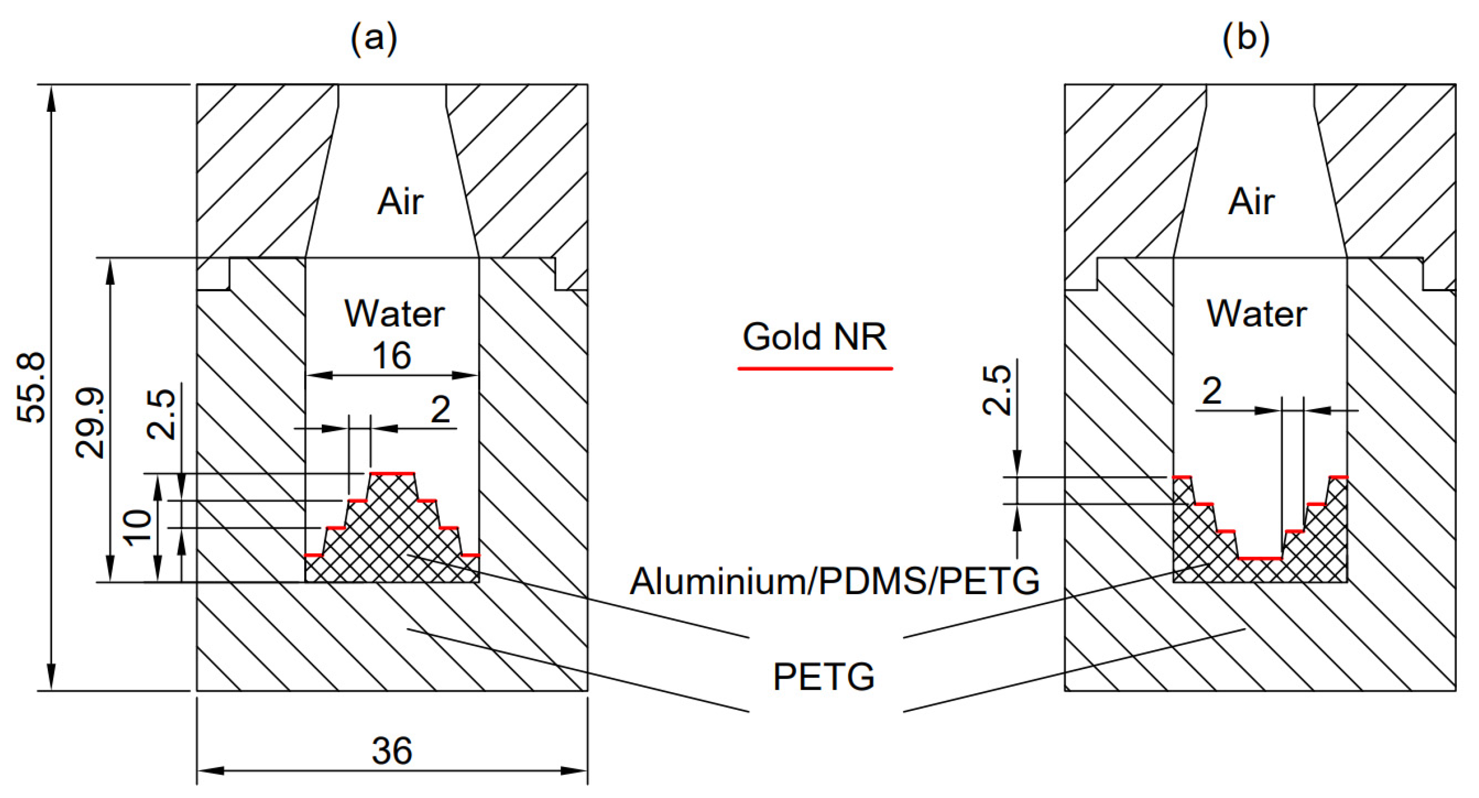 Table 2 summarizes the density and thermophysical properties of the solid materials constituting the chamber structure, namely PDMS, aluminum, gold, and PETG, based on literature data [42,43,44].