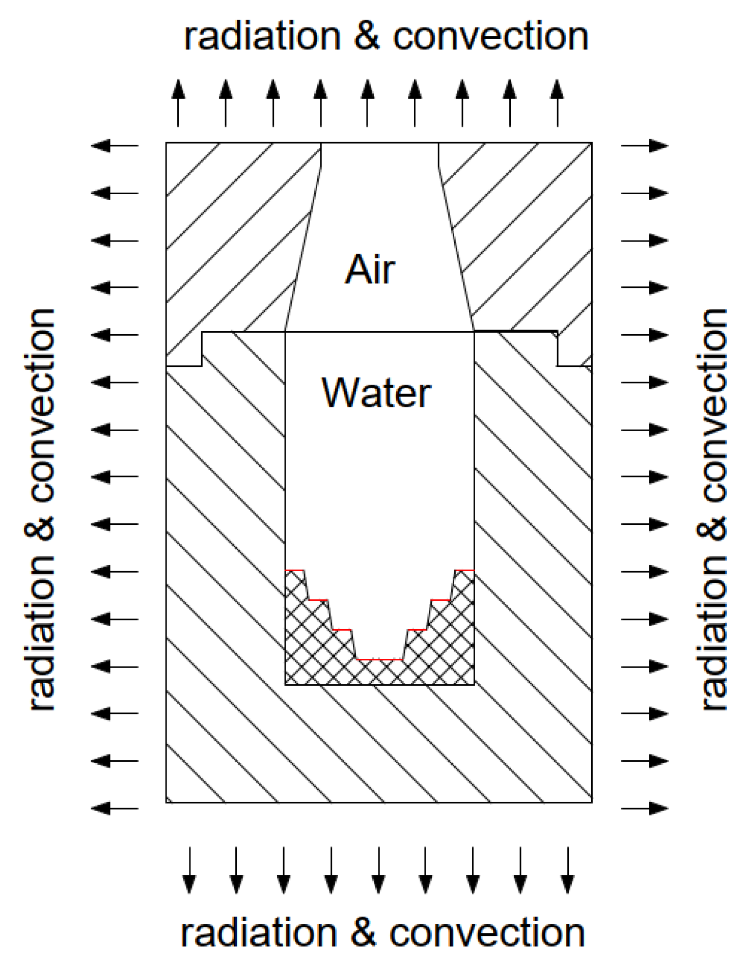 The fluid flow and heat transfer in the chamber is described by the Navier–Stokes equations and the energy equation [45]. The density ρ i ( T i ) in these equations is temperature-dependent, reflecting the effects of thermal expansion on the fluid dynamics within the device and natural convection processes. The momentum equation, energy equation, and continuity equation were used to model the behavior of air and water within the chamber. Continuity equation can be defined as follows [45]: