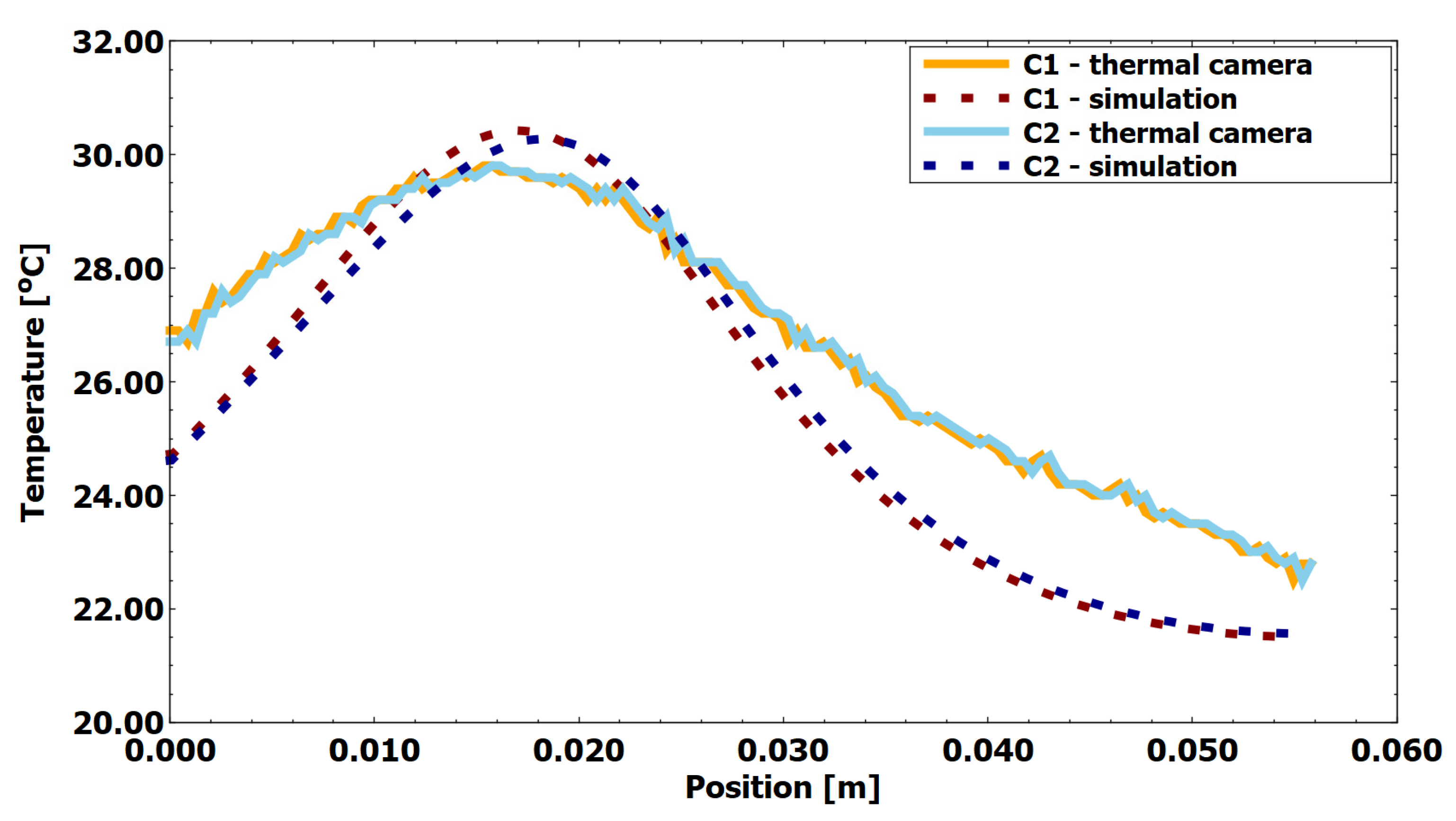 In addition to these conceptual considerations, practical limitations related to the experimental setup were taken into account. During the model calibration and validation stage, the experimental chamber was fabricated entirely from PETG, which served simultaneously as the base material and as thermal insulation. A comparison of the thermophysical properties of PETG and PDMS indicates that these materials exhibit similar thermal characteristics, with differences in volumetric heat storage capacity at the order of 7%. This similarity supports the use of PETG in the experimental configuration while maintaining consistency with the numerical analysis.