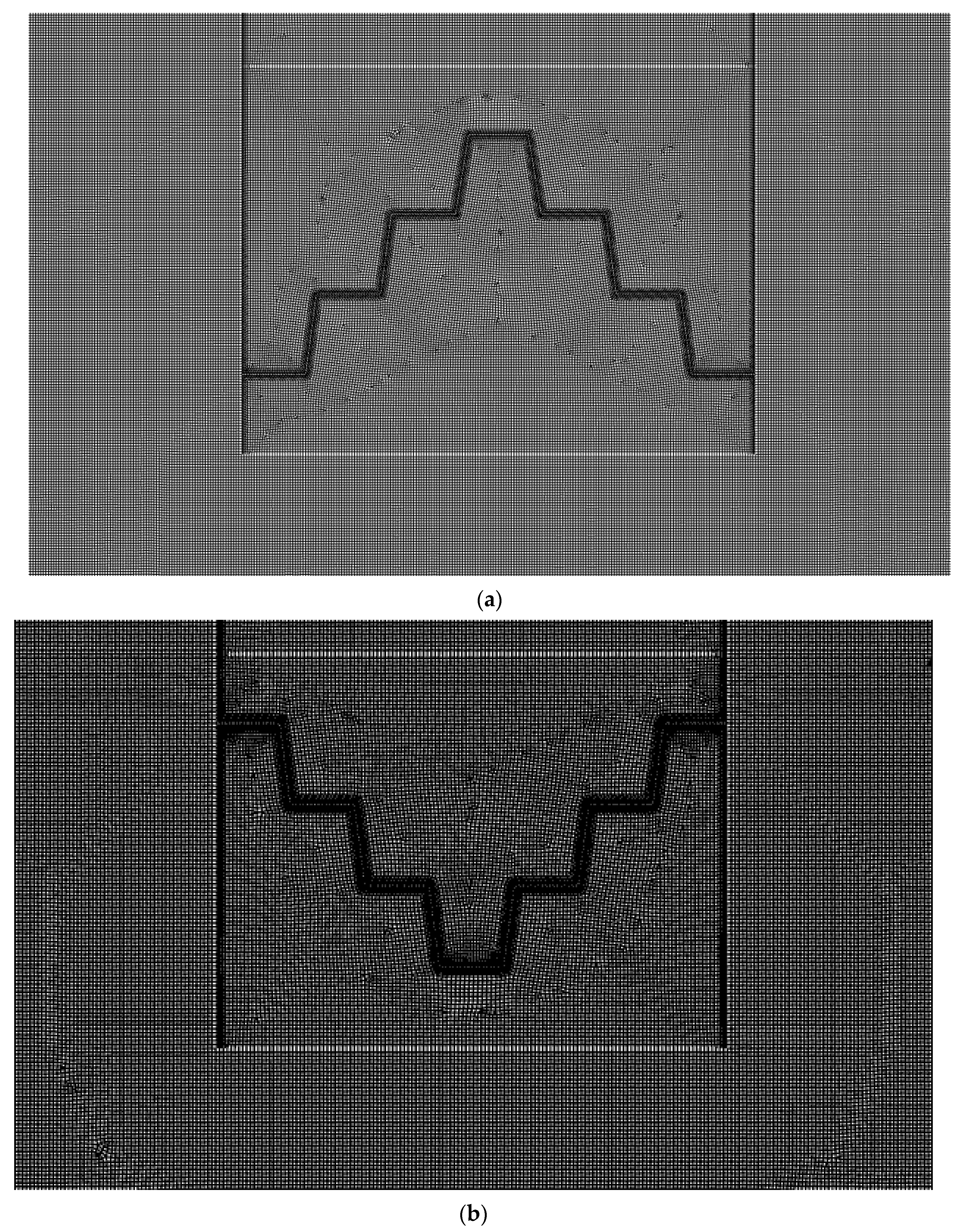 Figure 9. Discretization of the computational space, namely: (a) in gradually ascending stepped structure with highlighted area of the base and water; (b) in gradually descending stepped structure with highlighted area of the base and water.