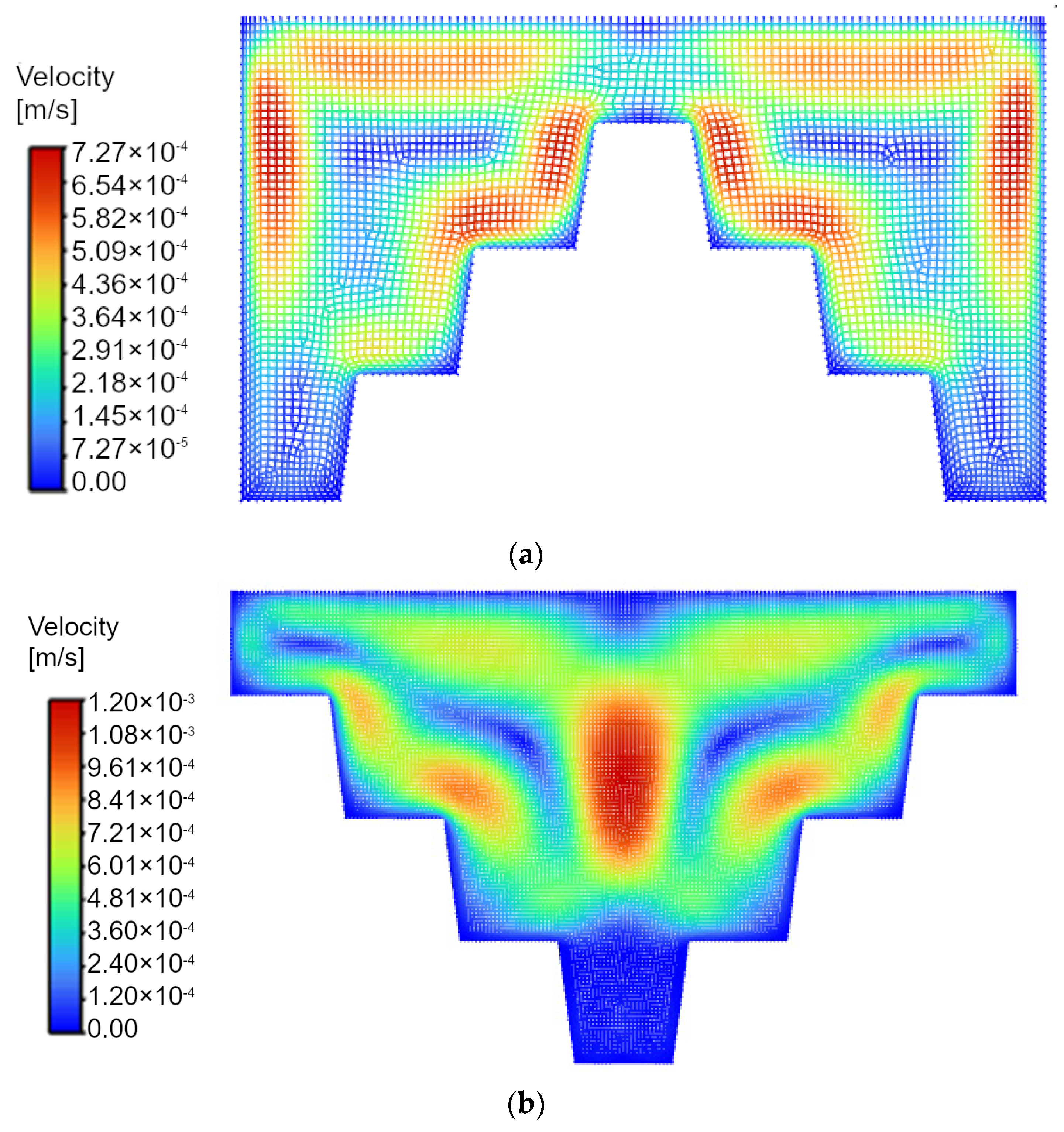Figure 10. Velocities’ distribution in the mesh, namely: in gradually ascending stepped structure with highlighted area of the water (a), and in gradually descending stepped structure with highlighted area of the water (b).