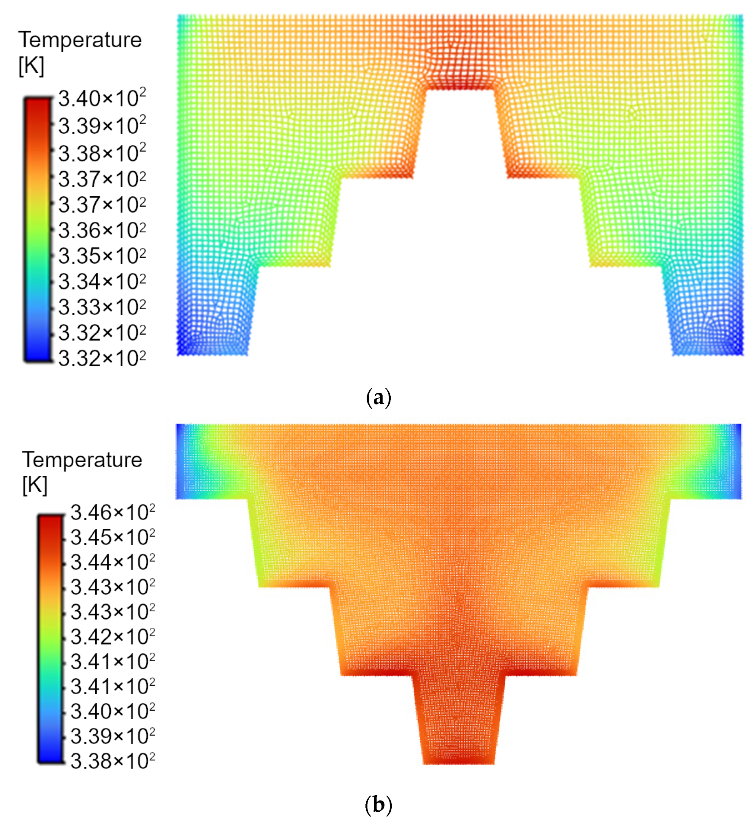 Figure 11. Temperature distribution in the mesh, namely: in gradually ascending stepped structure with highlighted area of the base and water (a), and in gradually descending stepped structure with highlighted area of the base and water (b).