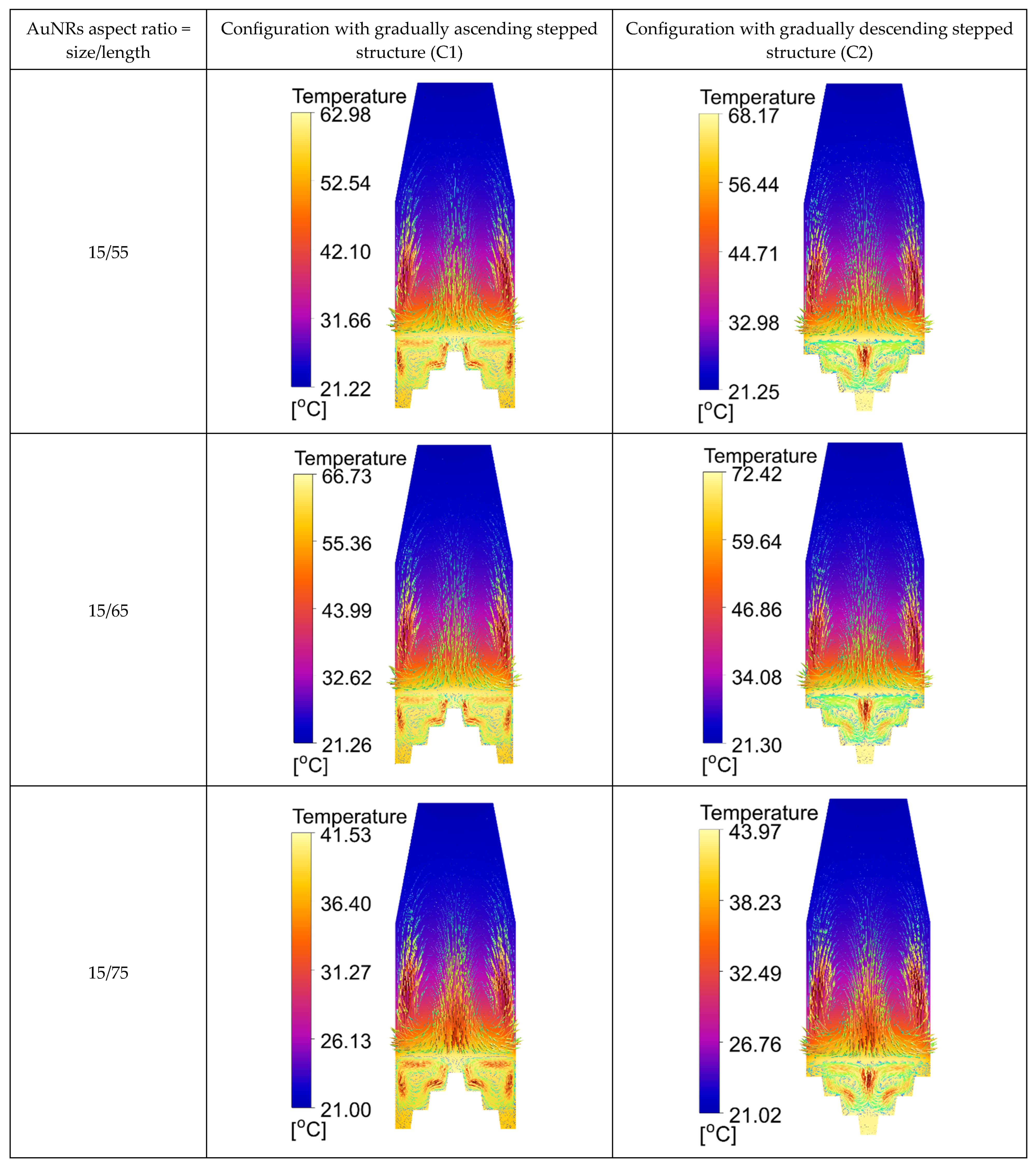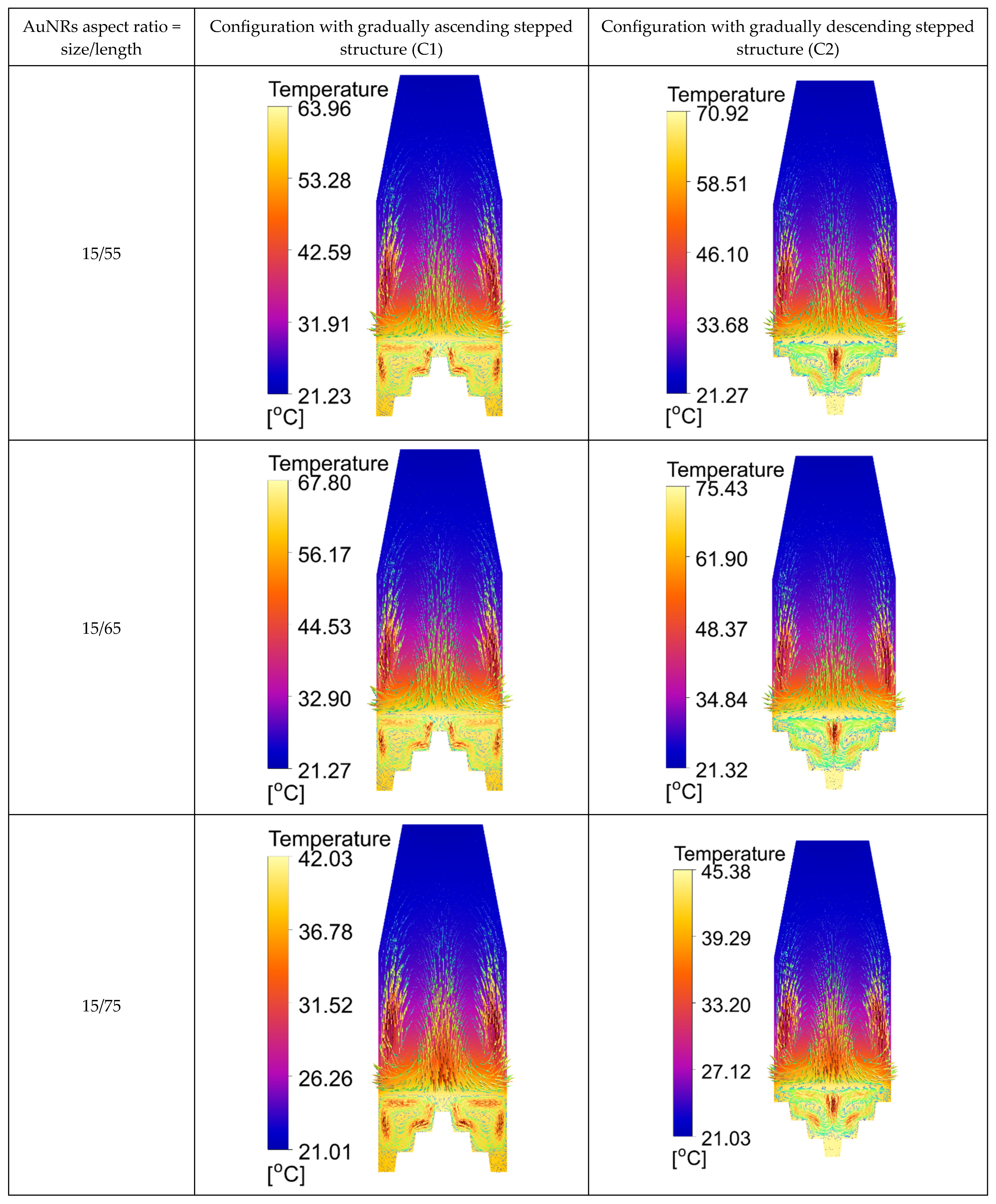 Table 6. Results of maximum, minimum, and mean temperature values of the water in °C using various AuNRs’ aspect ratios and both configurations of heat source, in the case of PDMS as base material.
