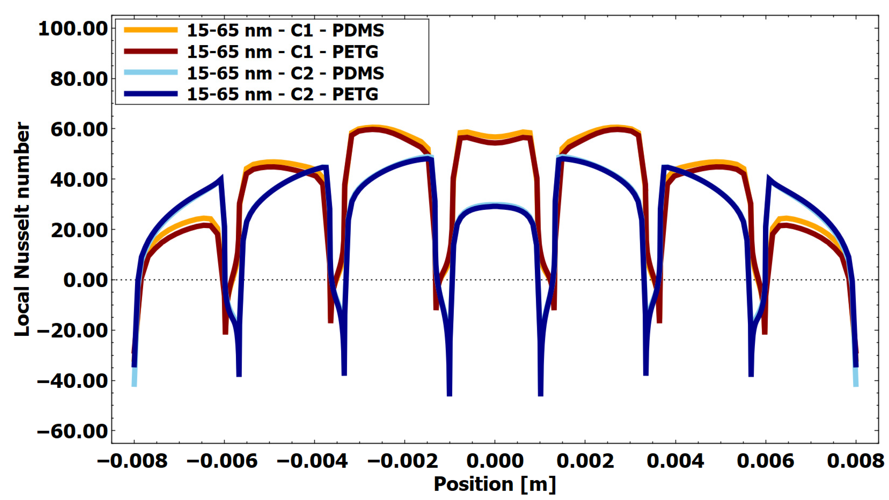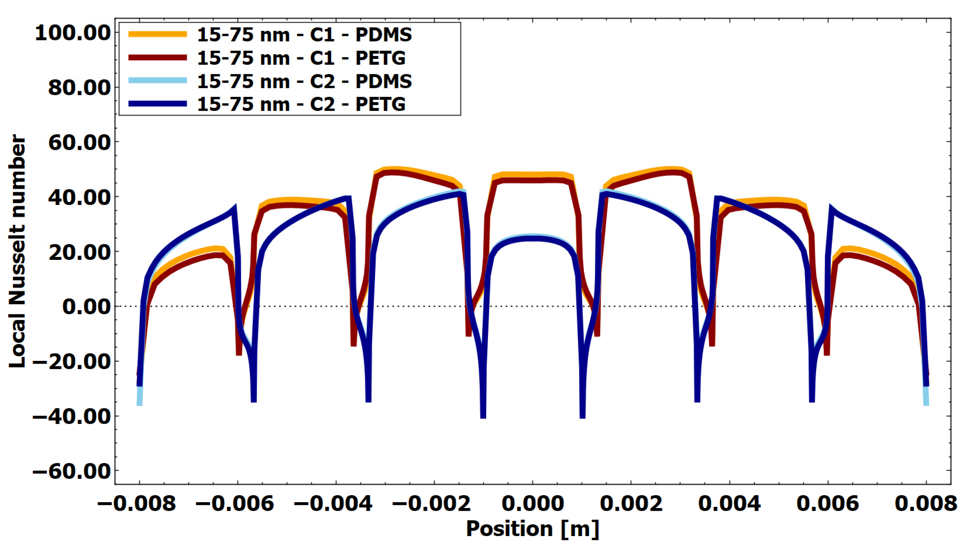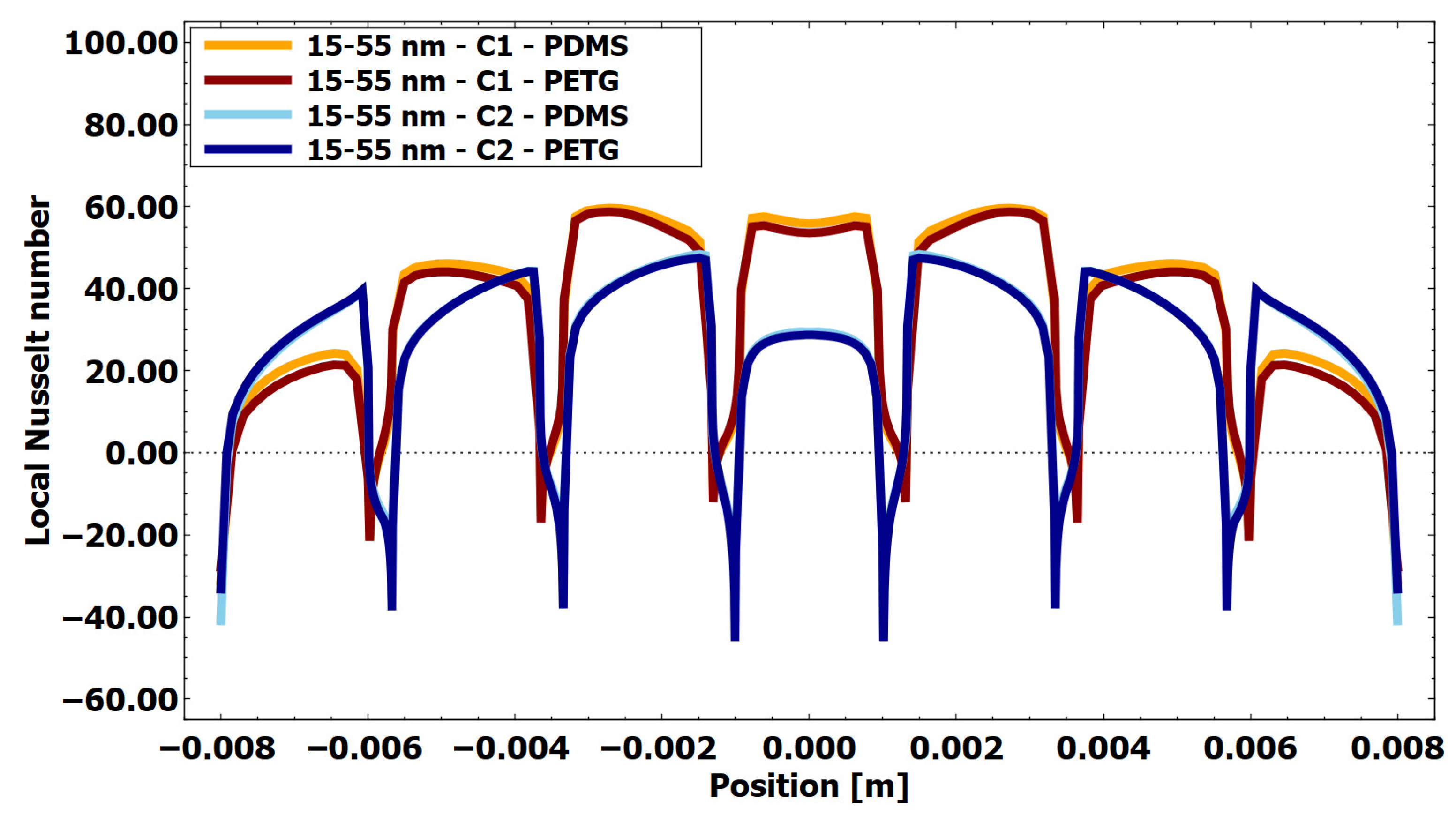 Figure 14. Local Nusselt number at the heat source for an aspect ratio of 15/55 for AuNRs, using PETG insulation and PETG and PDMS as the base (X-axis representing the distance along the base of the chamber with deposited AuNRs).