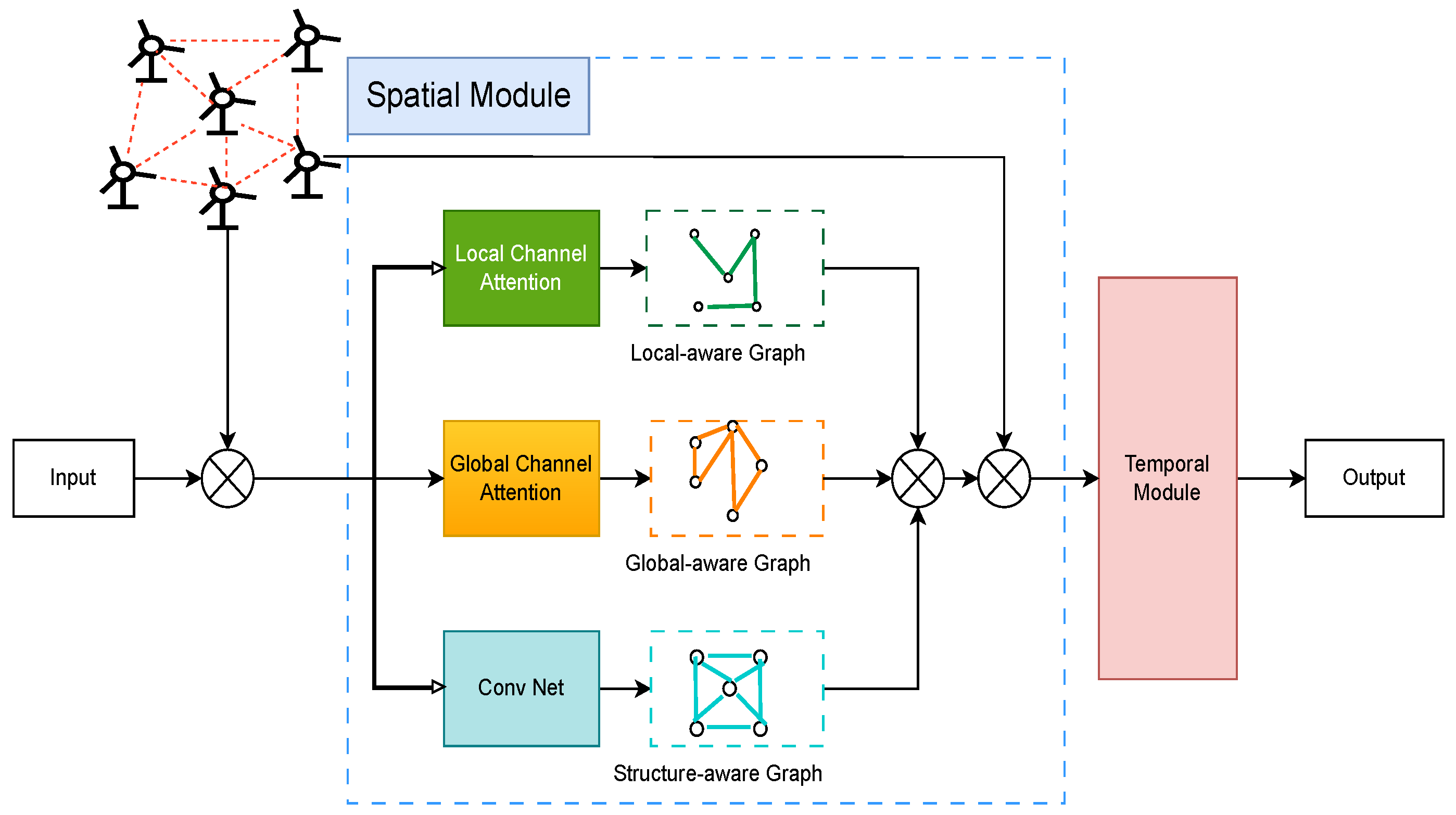 - A Multi-Level Attention Mechanism for Graph Construction. The model constructs a flexible graph using three distinct attention mechanisms: self-attention for learning dynamic global topology, global channel attention for modeling long-range dependencies, and local channel attention for capturing short-range spatial correlations. This multi-attention design allows the model to flexibly adapt to both local turbine dynamics and global meteorological influences.