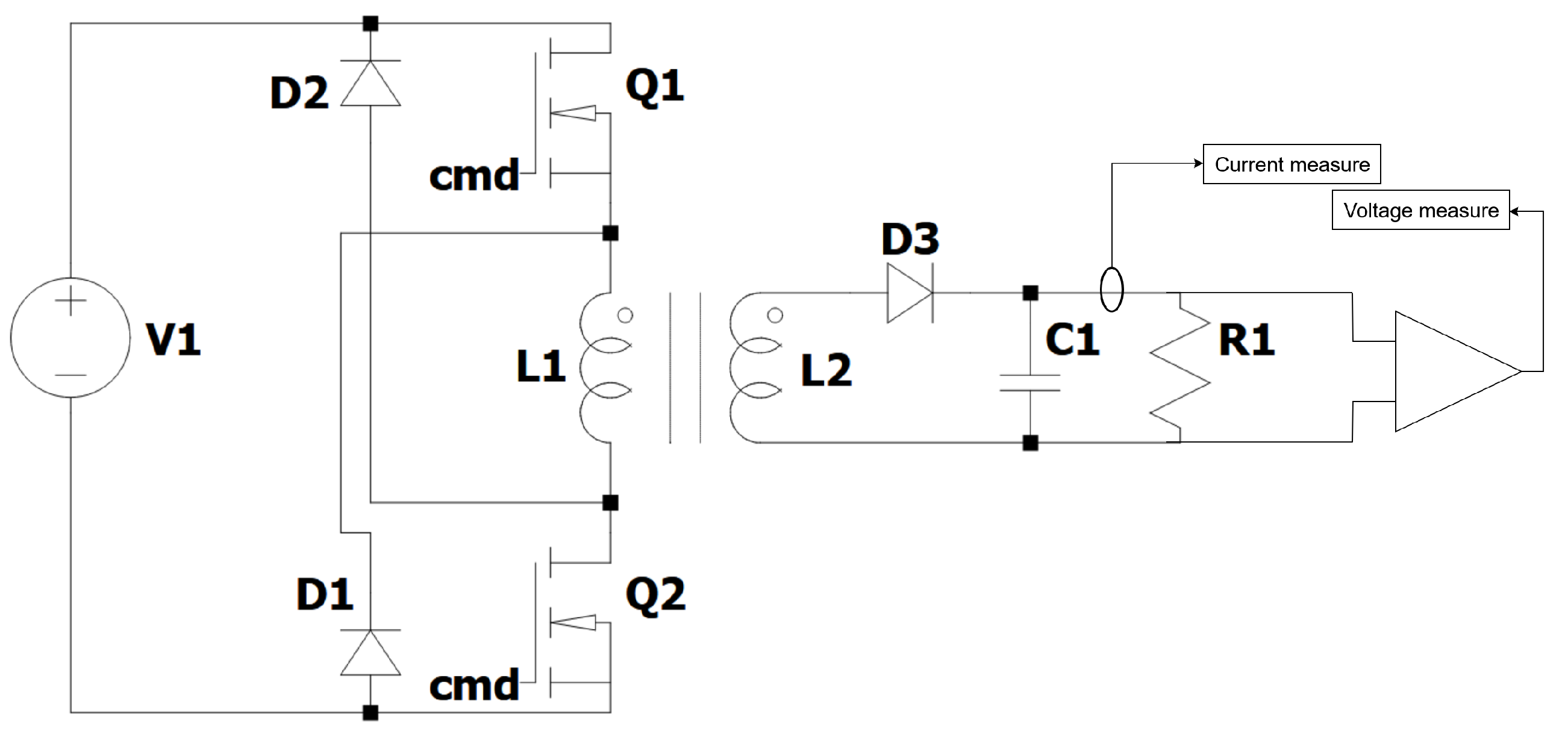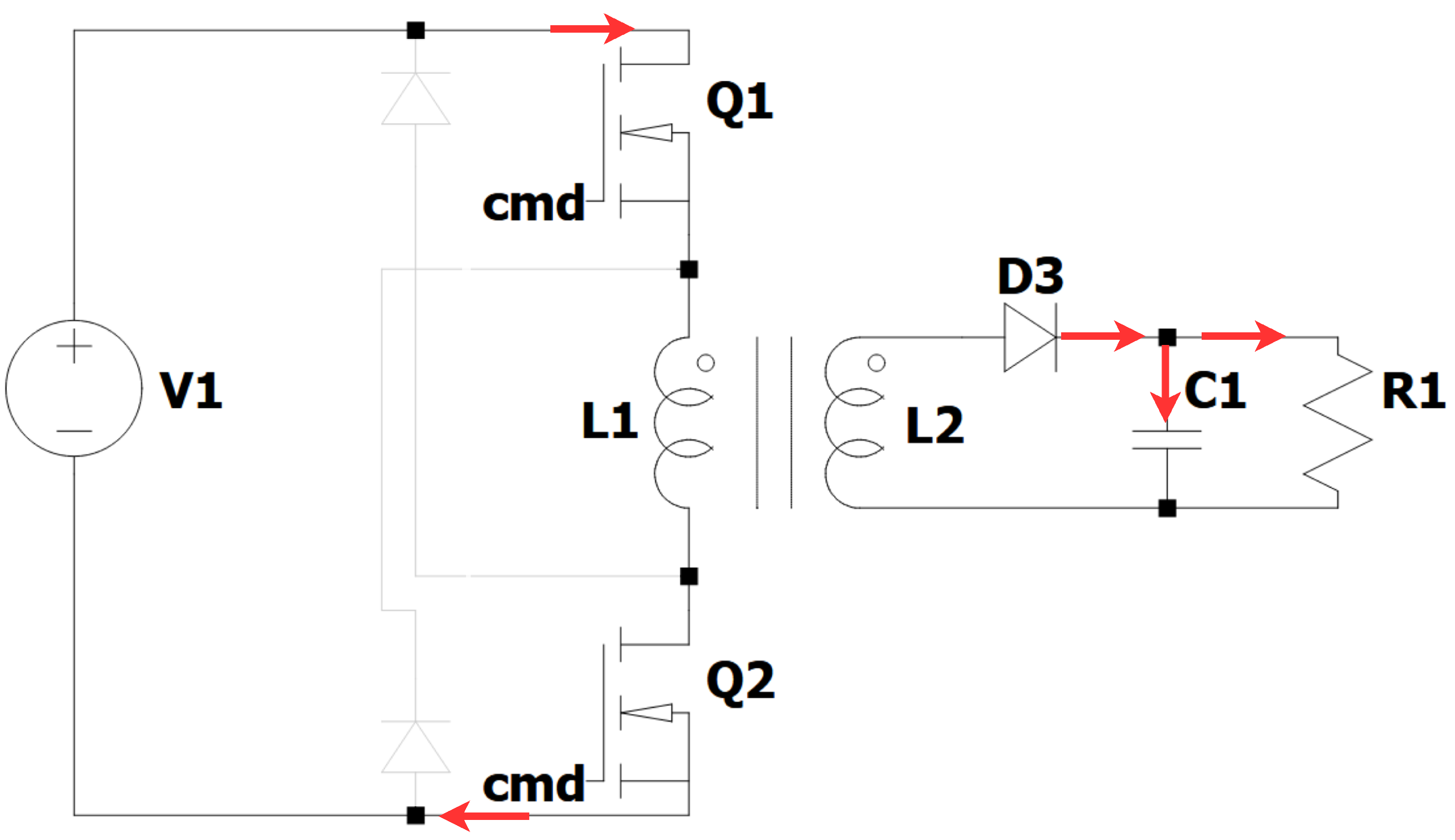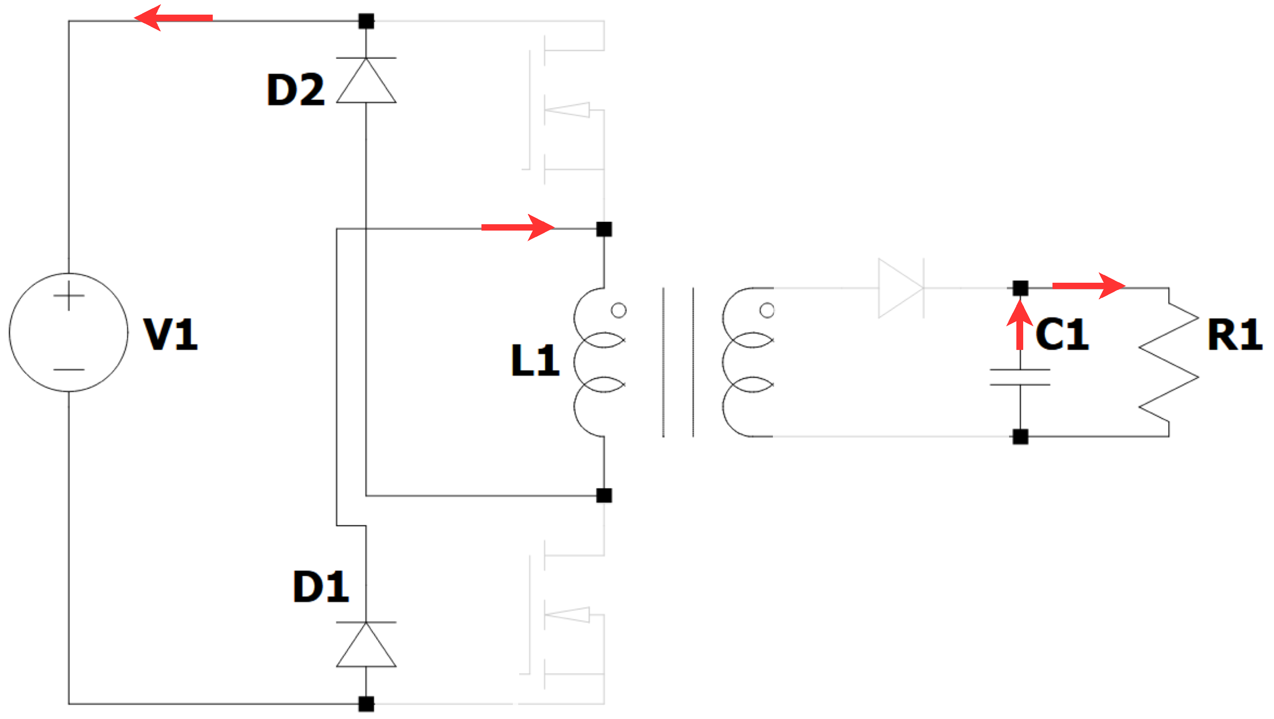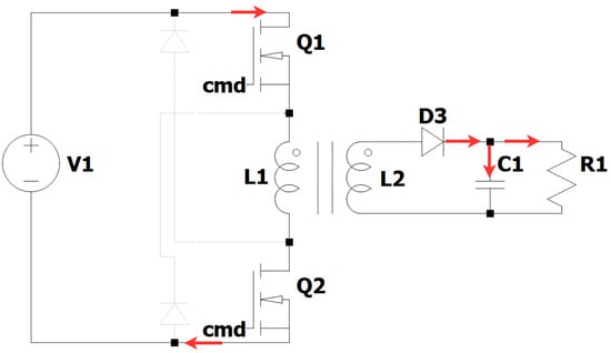 Figure 2), V1 is impressed on primary winding L1. As a result, the current inflow magnetizes the transformer core and induces a corresponding voltage at secondary winding L2. The diode D3 is forward biased, and, therefore, the current passes through the load R1 as well as capacitor C1 that it charges. During this period, the transformer delivers power from V S to OUT, and the load current is regulated by manipulating Q1’s and Q2’s duty cycle.