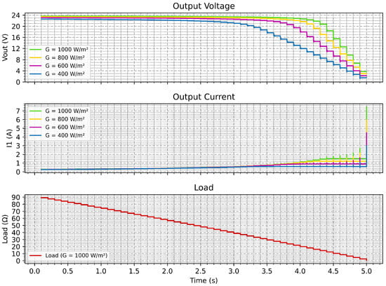 This section presents a comprehensive analysis of the emulator’s behavior under different operating conditions, including variations in irradiance, temperature, and load. Each set of results offers insight into the accuracy and dynamic performance of the system.
