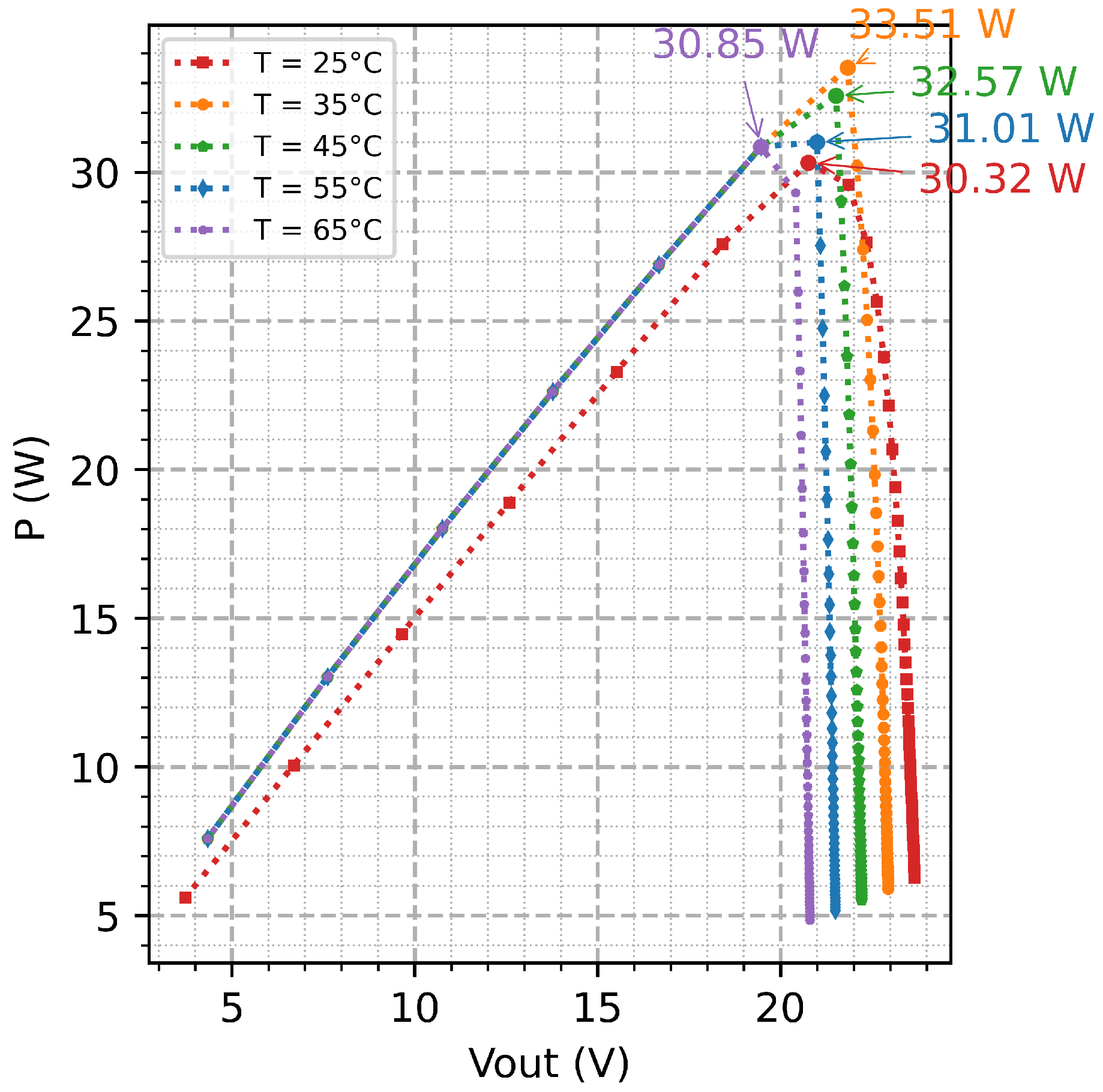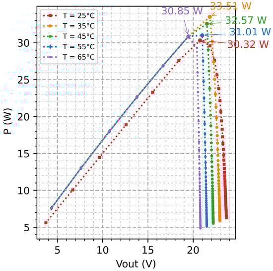 Figure 9. With the increase in temperature from 25 °C to 65 °C, maximum power diminishes; at around 35 °C, the P
