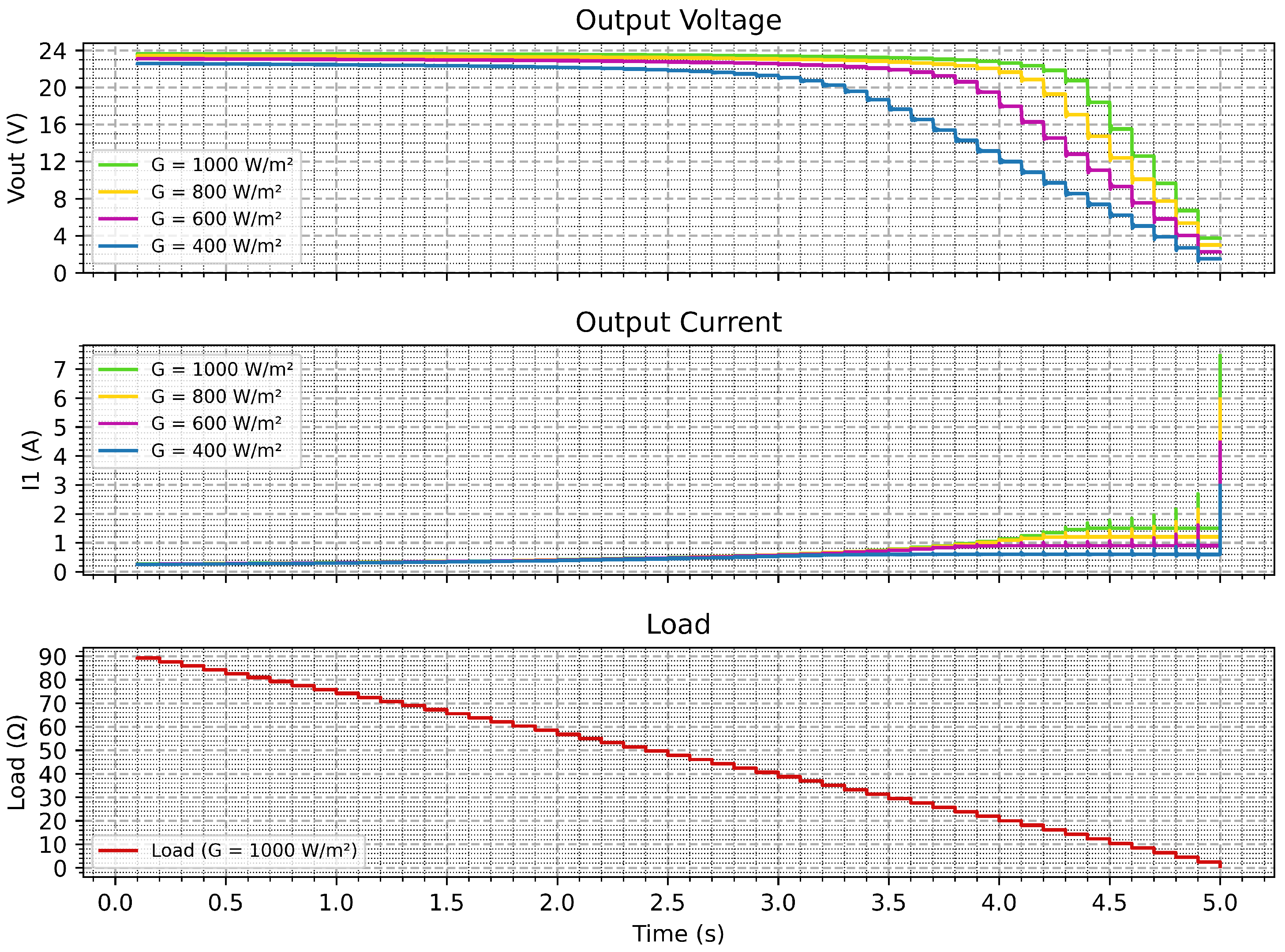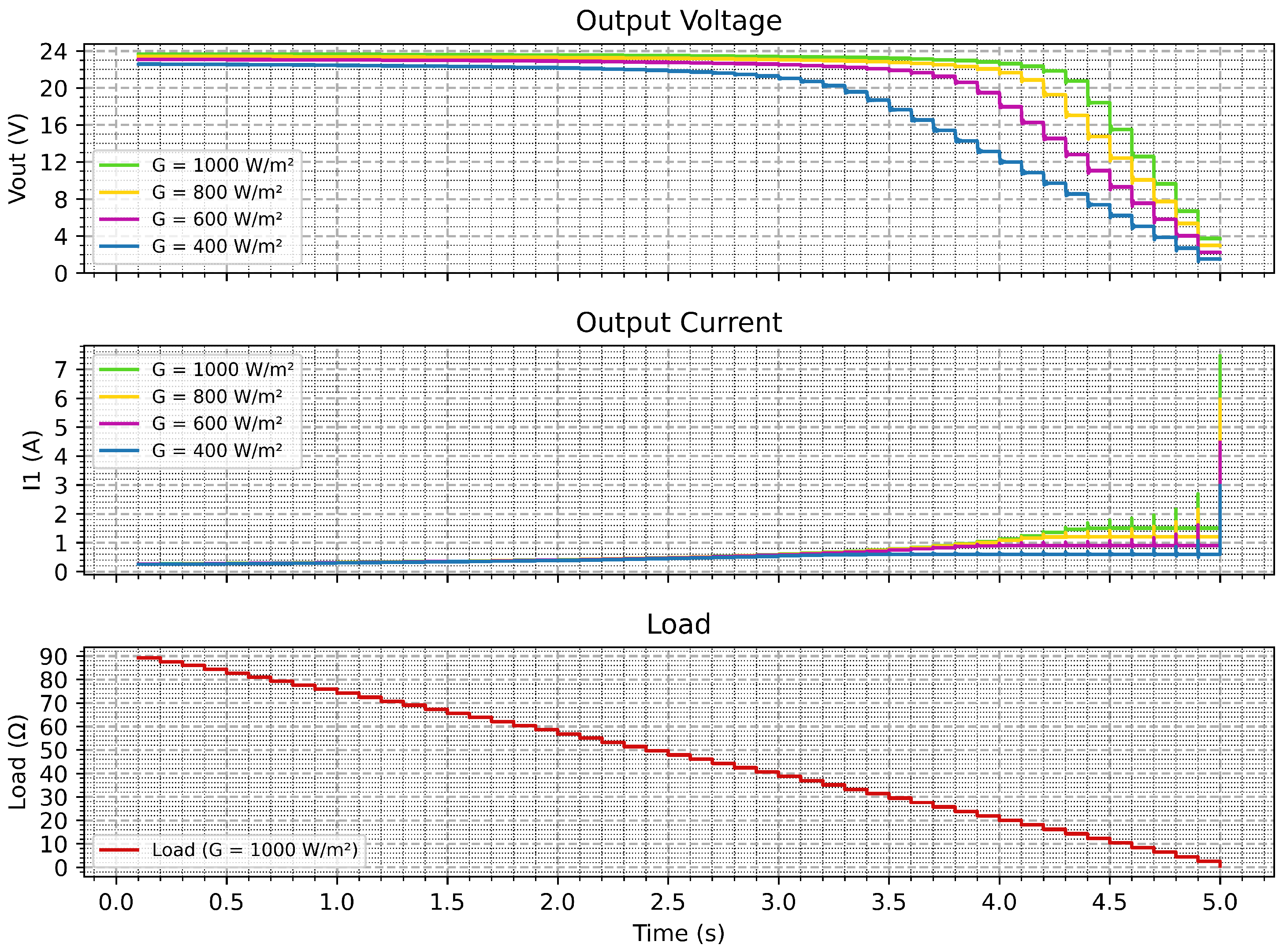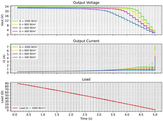 Figure 8. The voltage plot at the top shows a slow decrease as the load is increased. On the other hand, the output current (middle panel) rises accordingly. The lower graph verifies a controlled resistance step down that breadboards in the emulator through large sets of bias points. As a whole, looking at the tests, the system is stable, and there are no noticeable oscillations or lag to be detected whatsoever, which reflects the adequacy of using this control strategy for real-time applications.