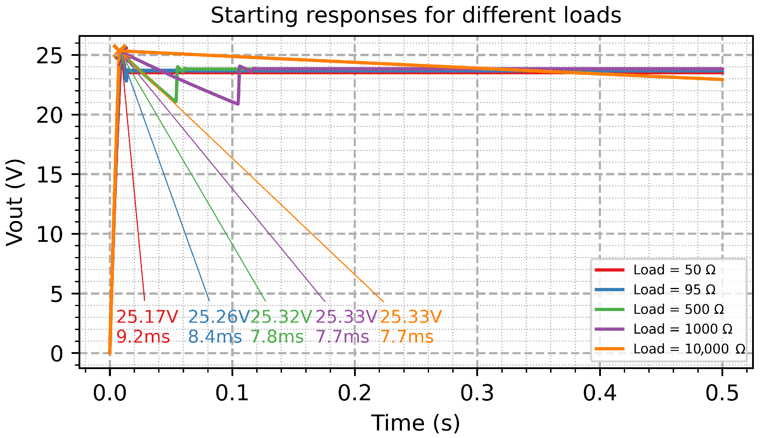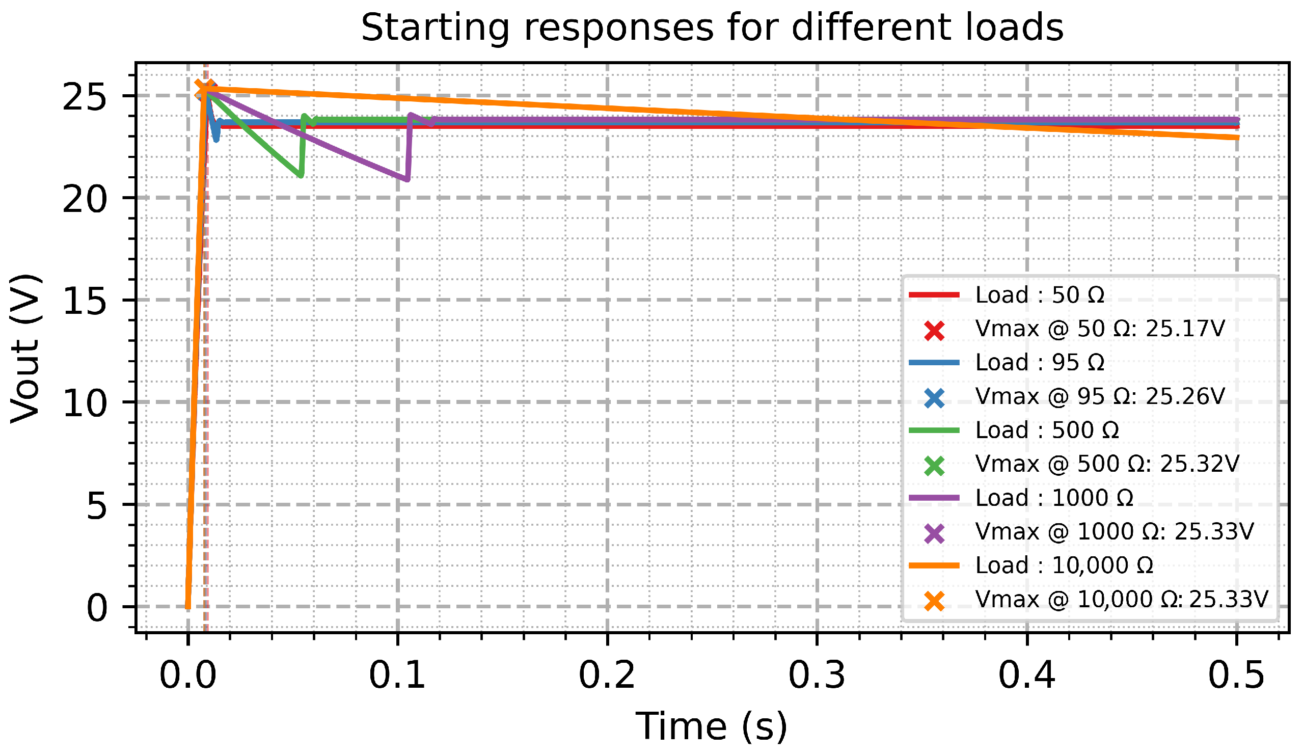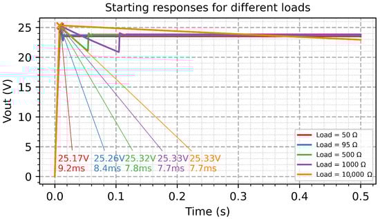 The start-up behavior is a performance index of the power electronics system. The output voltage of the emulator during start-up for resistive loads from 50 Ω to 10 kΩ is illustrated in
