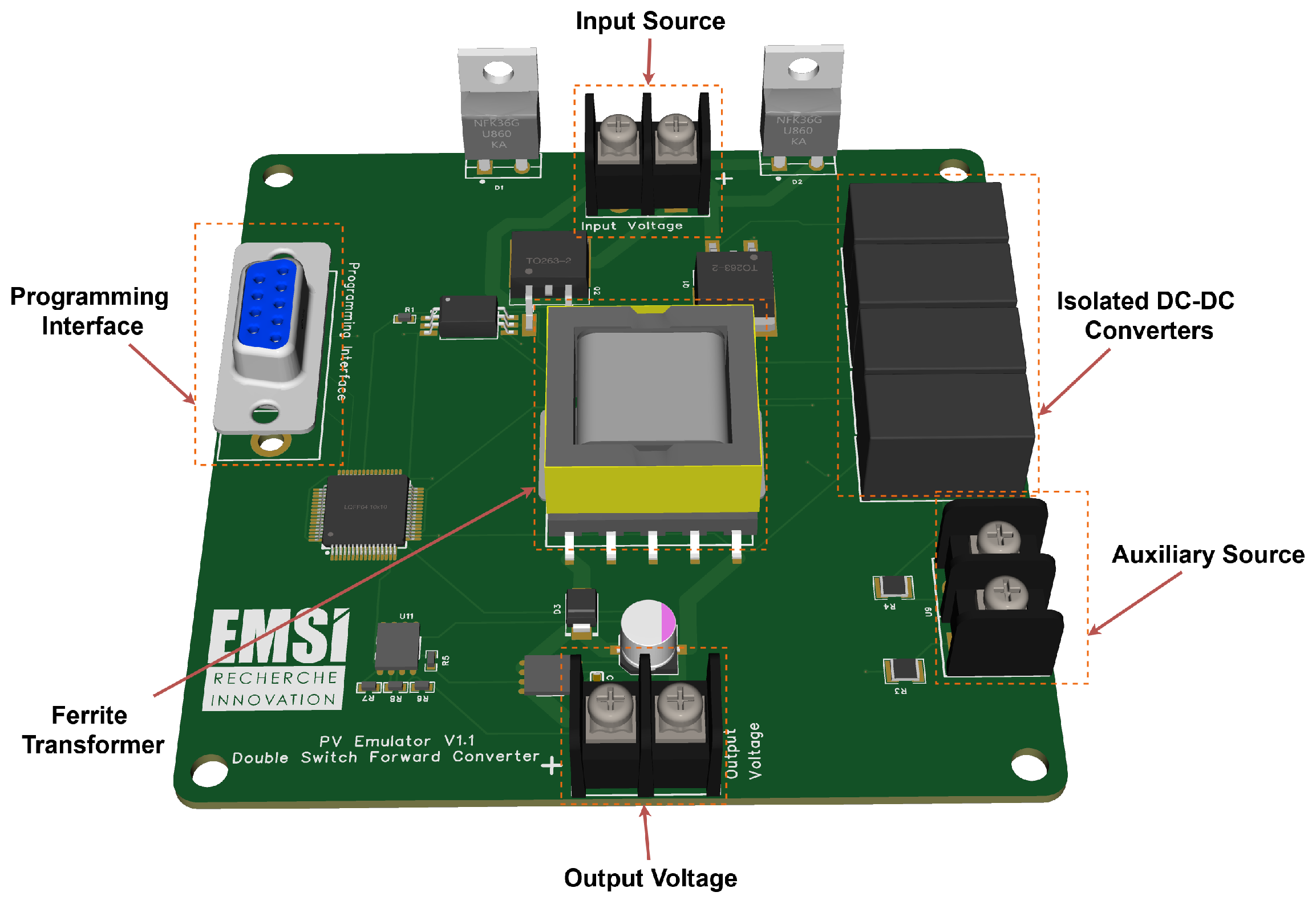 Figure 5 shows the internal control loop of the proposed PV emulator that emulates dynamic electrical characteristics of a photovoltaic panel according to ambient temperature and irradiance levels. The method applies real-time measurements of voltage and current sensors and environmental data in the calculation of the photogeneration current using a mathematical model. This value is compared to the real current, and error is reduced using a two-stage PI regulator. Then, the output of the MPPT controller will be presented to a PWM generator, and emulator voltage signal is controlled in order to resemble a real PV source as much as possible while testing and validating systems. The developed PV 1 emulator is based on a custom two-layer PCB, in which the power conversion stage, as well as its control and sensing blocks, together with communication peripherals are integrated. A two-switch forward-converter architecture is used with high-speed power MOSFETs driven by specialized gate driver ICs to achieve stable and also balanced switching of the primary transformer section as presented in