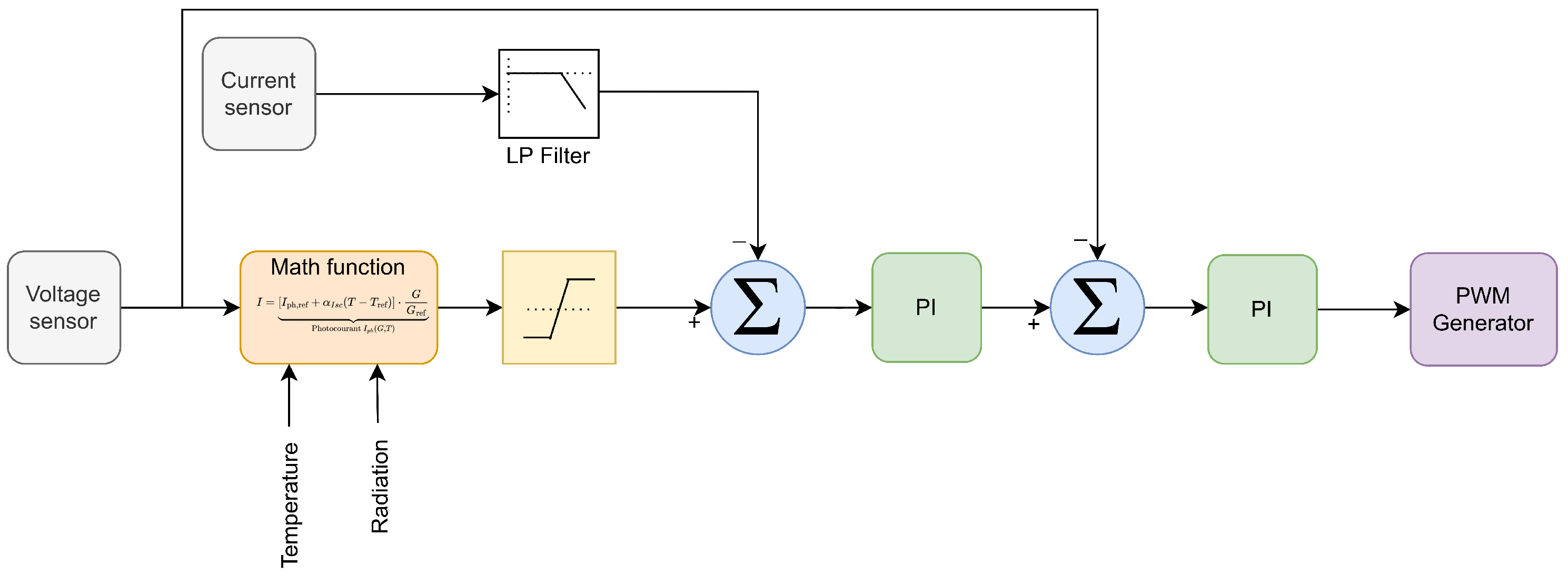The control block is structured around two cascaded Proportional–Integral (PI) controllers: