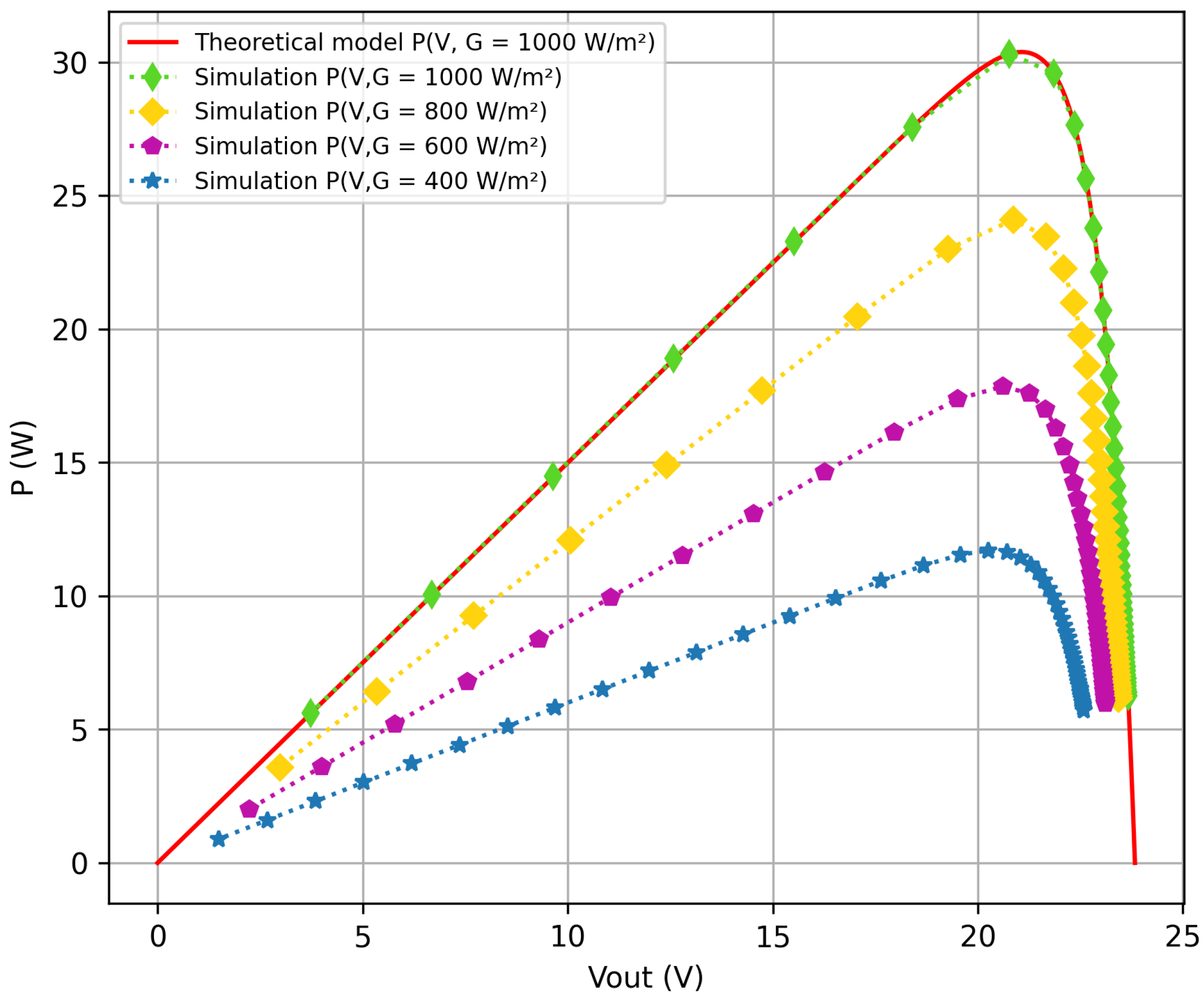 Figure 7. At higher fluence, the peak power varies linearly with it, and its voltage at maximum power point does not change a lot. These results demonstrate that the emulator can reproduce the anticipated P–V response for varying lighting actions. The superposition of the simulated and theoretical curves at full irradiance confirms again the fidelity and soundness of the model.