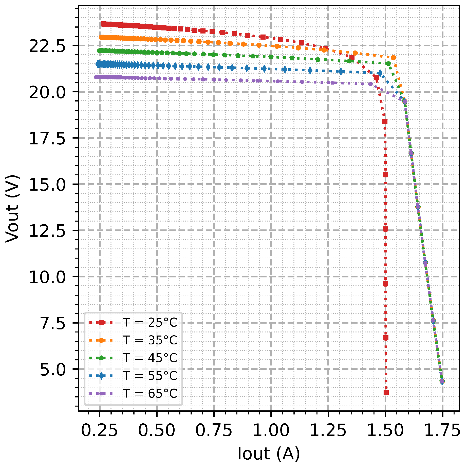 Figure 10. Again we see that with increasing temperature, the voltage decreases, whereas the current stays roughly constant. This is expected due to the physical properties of silicon solar cells. The emulator smoothly reproduces the thermal effects so they are not distorted, increasing confidence in control and modeling during its design.