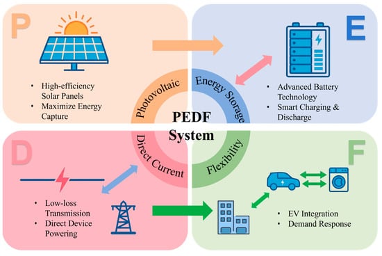 While previous studies have explored various components of building-level energy systems—such as photovoltaic generation, energy storage integration, direct current distribution, and flexible demand response—these technologies have often been examined in isolation or under narrow application scopes [8,9]. In contrast, this review adopts a holistic perspective by integrating these elements under the unified PEDF framework. This approach enables a more systematic evaluation of their synergies, technical barriers, and implementation outcomes in practical scenarios.