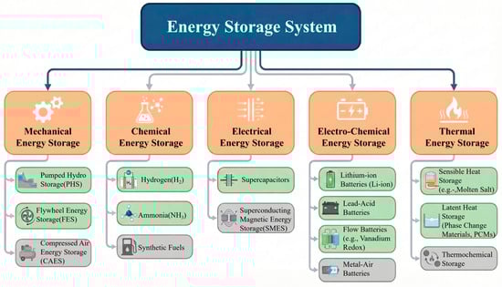 In PEDF architectures, energy storage acts as the strategic fulcrum, effectively decoupling stochastic PV generation from rigid user demand. Its integration defines not just energy efficiency, but the system’s economic resilience. Recently, the field has moved beyond a “one-size-fits-all” approach, evolving into a diversified landscape of electrochemical, mechanical, and hydrogen technologies [25]. Each category now addresses specific operational niches—from rapid frequency regulation to seasonal shifting—allowing for precise matching between technical characteristics and building requirements.