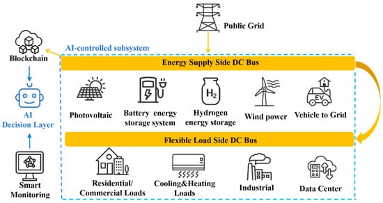 In particular, the potential of AI extends to the sophisticated optimization of hydrogen-based storage transitions. By employing deep learning (DL) and recurrent neural networks (RNN), researchers have demonstrated that P2H (Power-to-Hydrogen) conversion can be strategically synchronized with renewable surges, significantly enhancing the economic viability of seasonal energy shifting [59]. Furthermore, the convergence of AI with decentralized frameworks—such as federated learning and blockchain—addresses the critical imperative of data security [60]. This synergy ensures that distributed control in the system remains not only resilient and optimized but also cryptographically secure, fostering a trusted environment for multi-agent energy sharing. Figure 7 illustrates the intelligent architecture of a PEDF-based DC distribution system enabled by AI and smart grid integration.