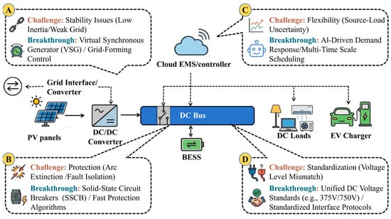 The ongoing decentralization of power systems—shifting from massive centralized plants to distributed, medium-to-low voltage networks—has exposed the inherent inefficiencies of traditional AC backbones. Since the primary components of the PEDF ecosystem, ranging from PV arrays and battery storage to EV chargers and light-emitting diode (LED) loads, are natively DC, the adoption of DC distribution becomes a matter of topological logic rather than mere preference. By circumventing redundant DC/AC conversion stages, these systems can recapture approximately 14% of energy otherwise lost to heat [45]. Beyond efficiency, the elimination of frequency synchronization and reactive power compensation simplifies the control architecture, allowing for a leaner, high-power-density infrastructure. This structural alignment makes DC distribution not just an alternative, but the definitive framework for integrating the multi-unit renewable and storage assets central to PEDF applications. As summarized in Figure 6, DC systems can exhibit potential advantages over traditional AC configurations in terms of reduced conversion stages, simplified power interfaces, and compatibility with renewable and storage components. These characteristics make DC distribution a promising option for the system, particularly in scenarios where photovoltaic generation and battery storage operate natively on direct current.