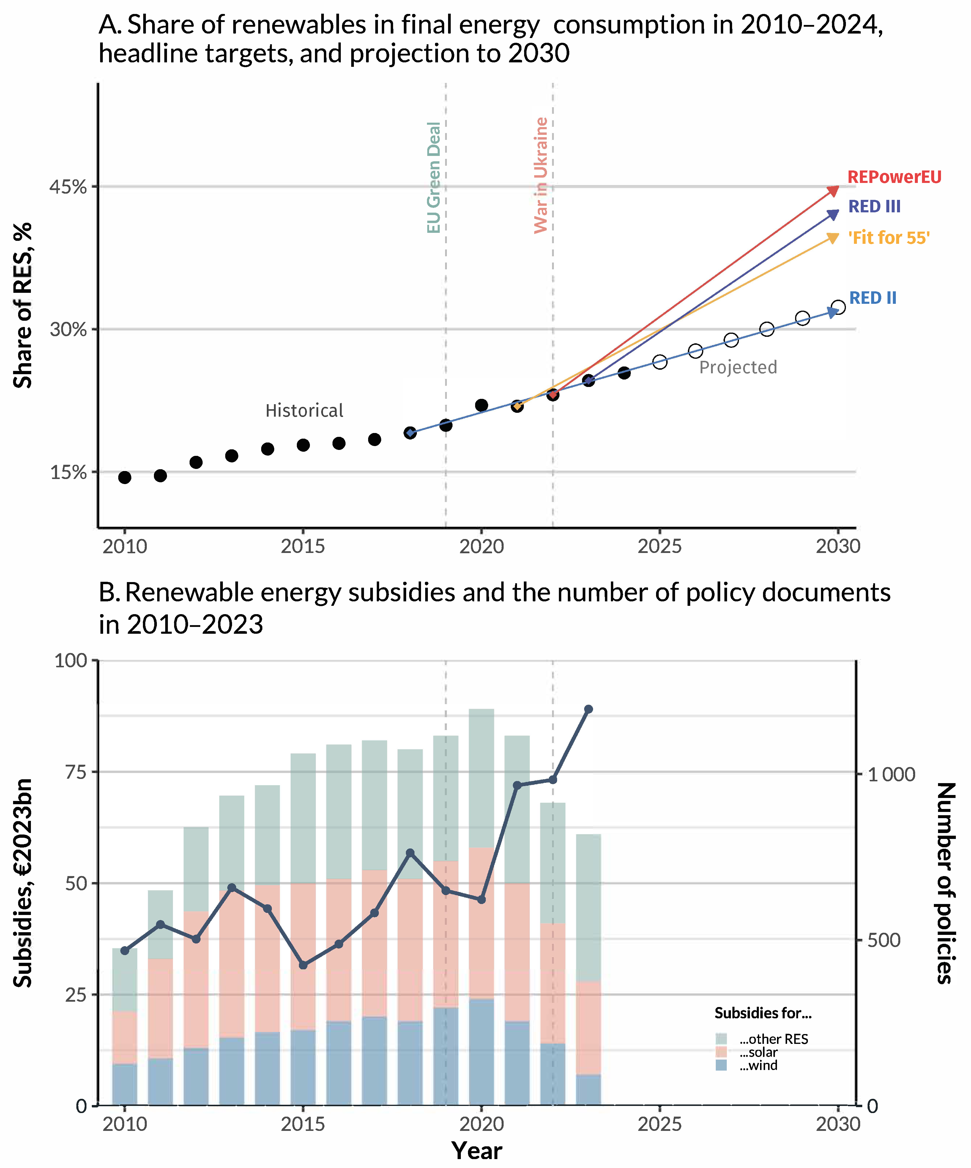 - Historical data and projections on renewable energy deployment and fossil fuel consumption—sourced from Eurostat, the European Environment Agency (EEA), the International Energy Agency (IEA), the International Renewable Energy Agency (IRENA), and the Institute for Energy Economics and Financial Analysis (IEEFA).