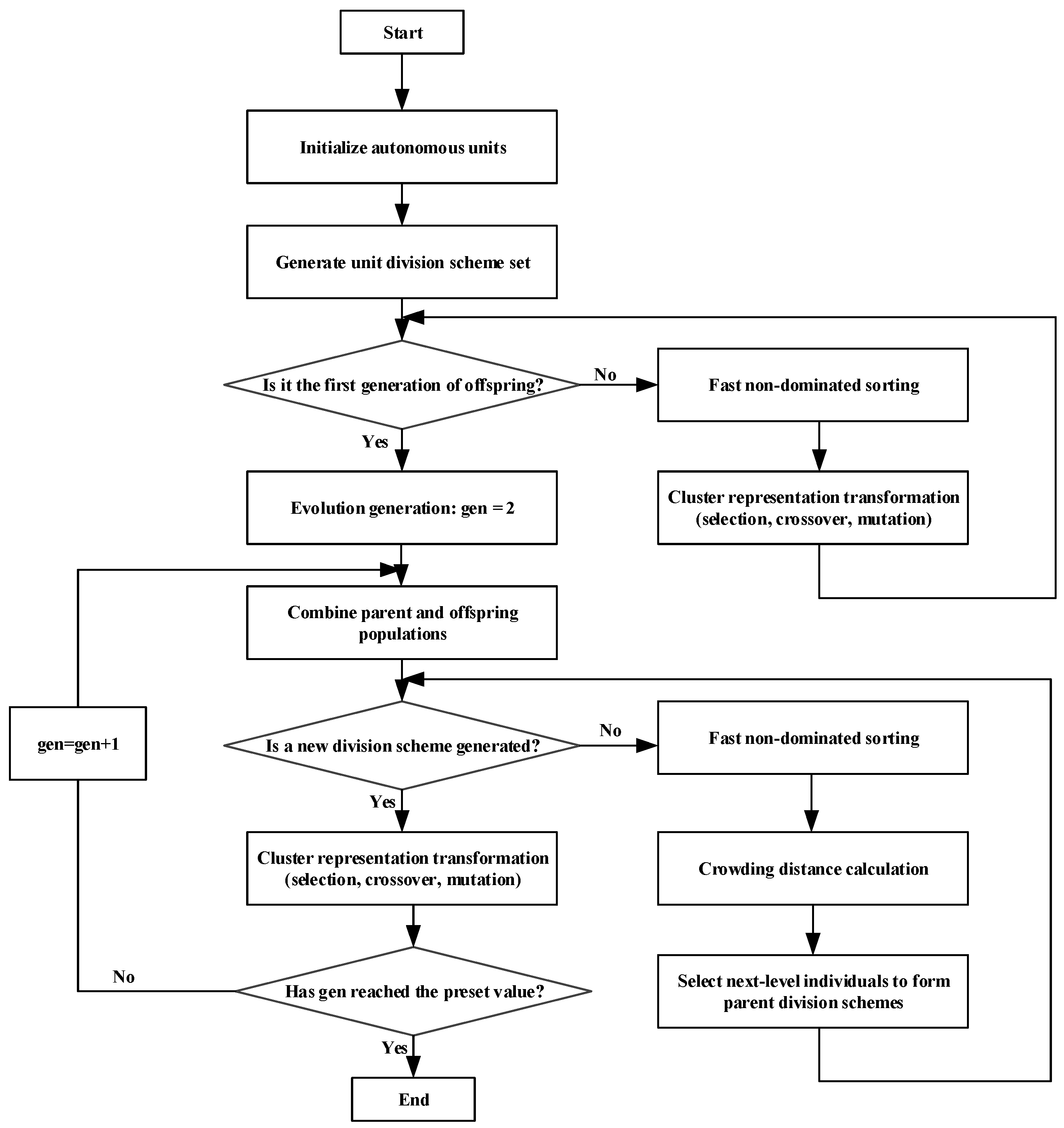 - A framework and division method for autonomous units in EADNs are developed. Following the principle of “tight coupling within units and loose coupling between units,” a comprehensive indicator system for autonomous unit division is established considering electrical modularity, active power balance, and reactive power balance. An improved genetic algorithm is employed for multi-objective optimization to ensure the electrical rationality and autonomy of the partitioning results.