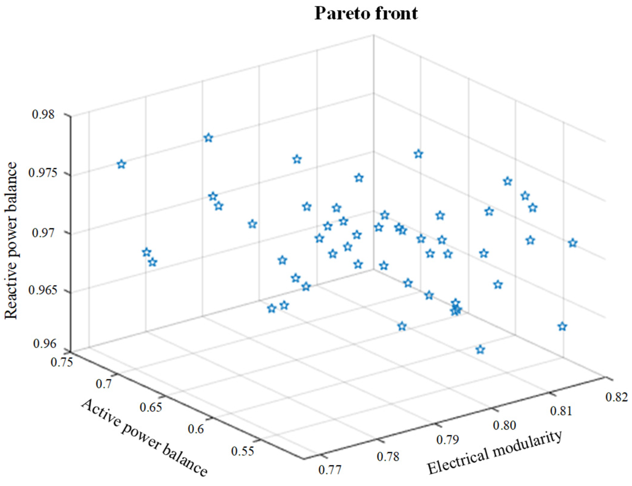 - Operational level: The division is evaluated using active and reactive power balance indicators. A higher balance degree indicates stronger self-balancing capability and a more reasonable partition of autonomous units.