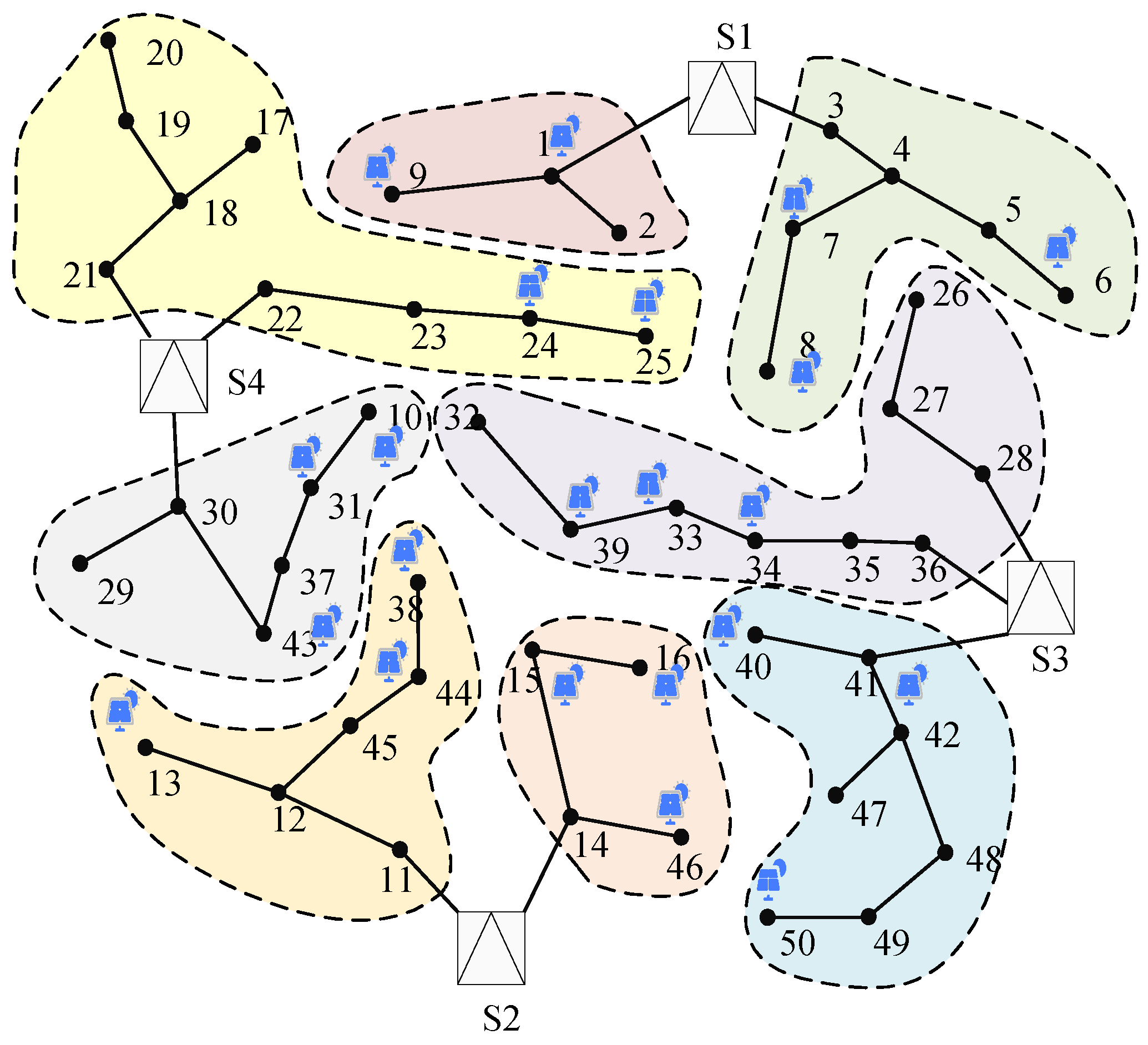 - Geographical level: The spatial distance between source–load nodes should not exceed the permissible supply distance, ensuring that geographically adjacent nodes are grouped together.