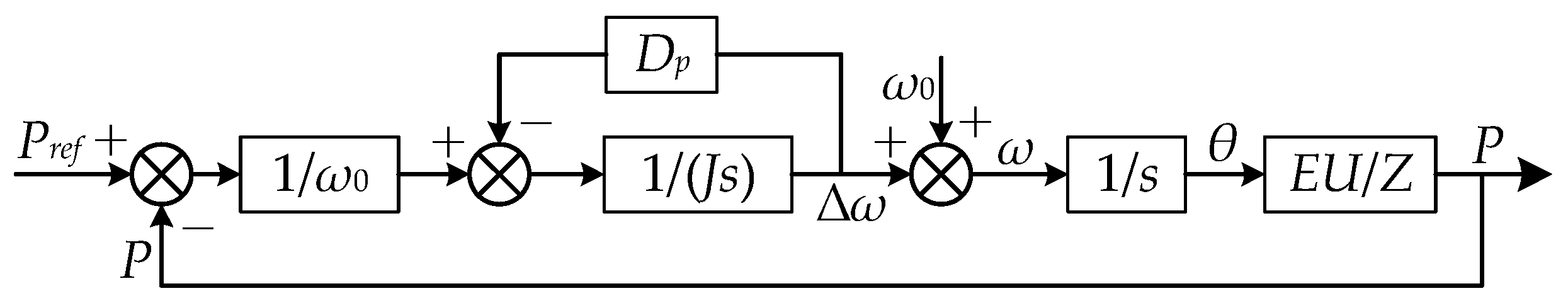 10], an adaptive VSG control strategy for grid-side inverters is proposed, wherein a tanh-based control law is designed using the power–angle characteristic curve to improve transient performance. In [