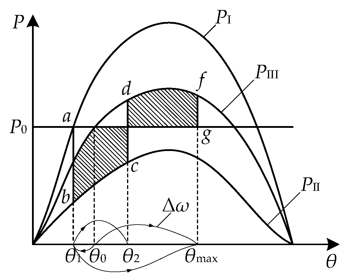 Stage II: When the power angle reaches θ2, if the faulted line is instantaneously cleared, the power angle remains momentarily unchanged, and the operating point jumps from c to d on curve PIII. At point d, the electromagnetic output power P exceeds the prime mover input power PT, producing a reverse power difference ΔP = PT − P < 0. Under this decelerating power mismatch, the machine’s kinetic energy is dissipated, and the rotational speed begins to decrease.