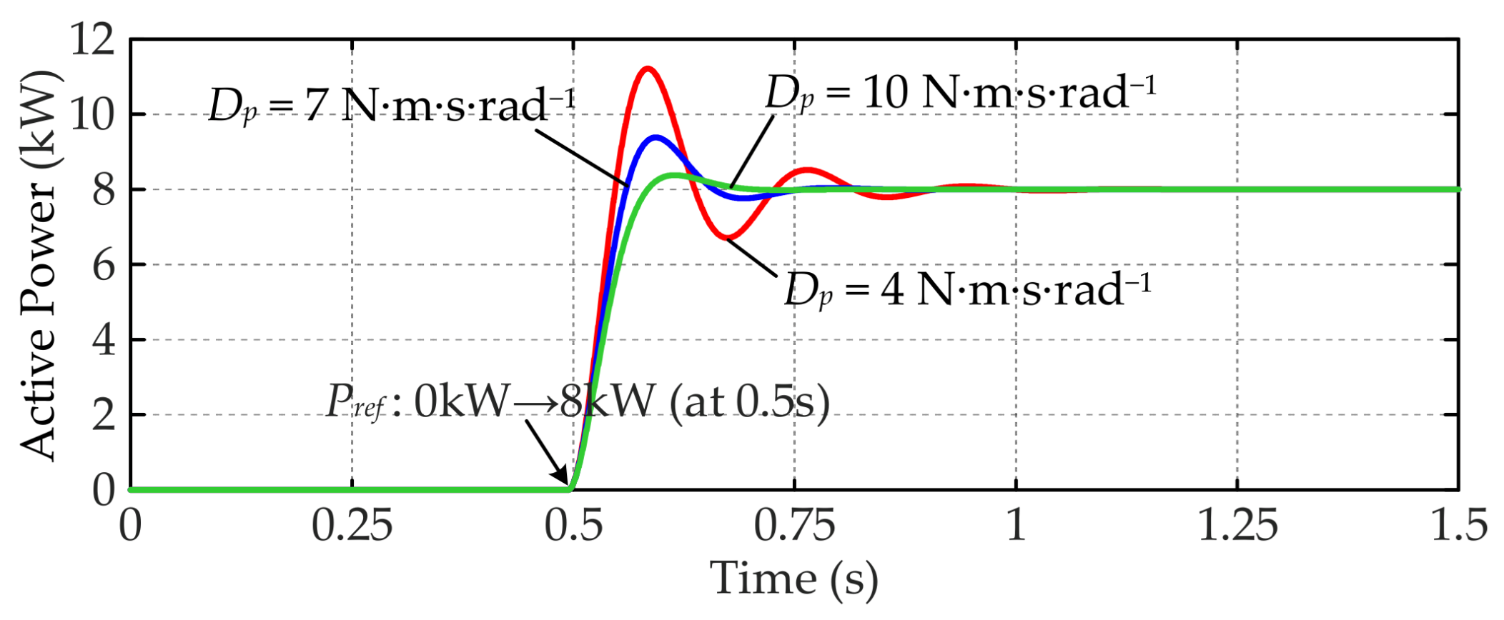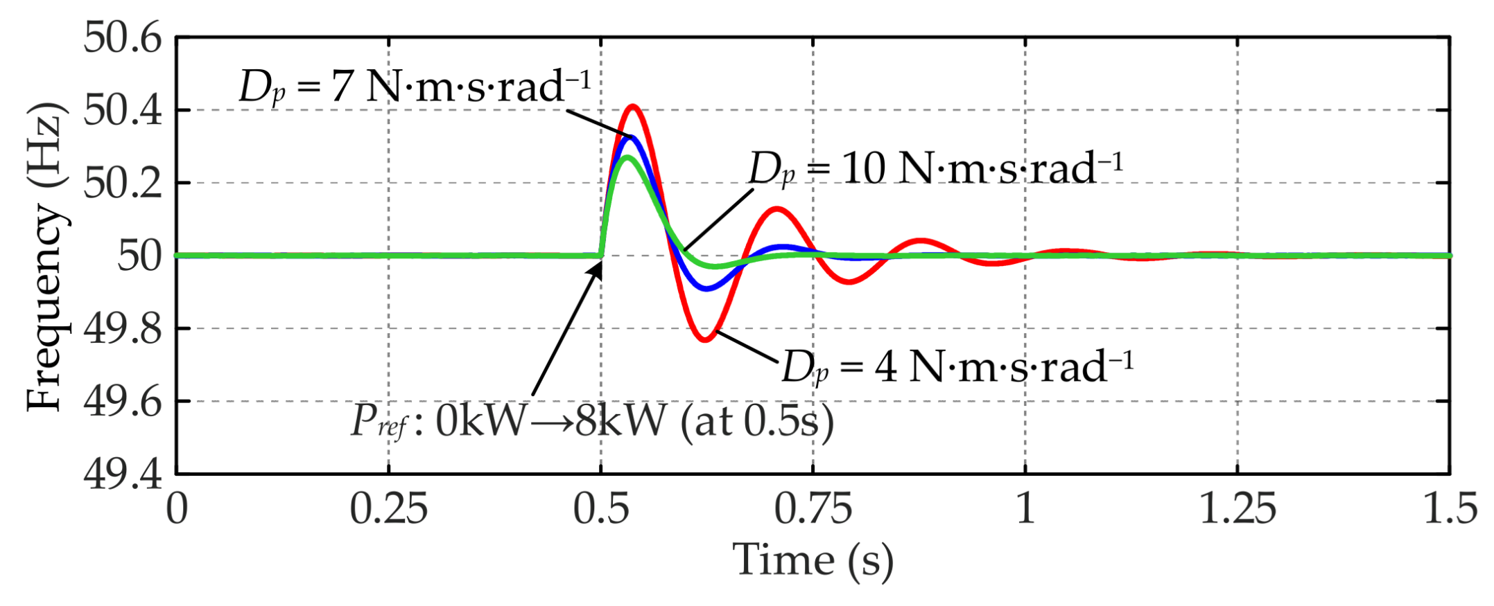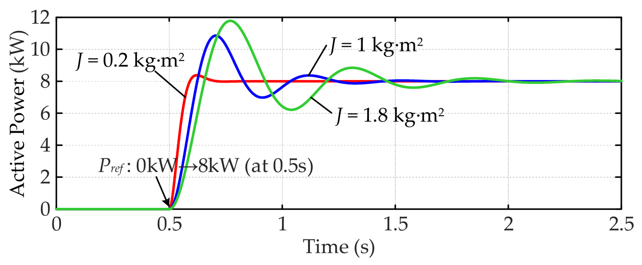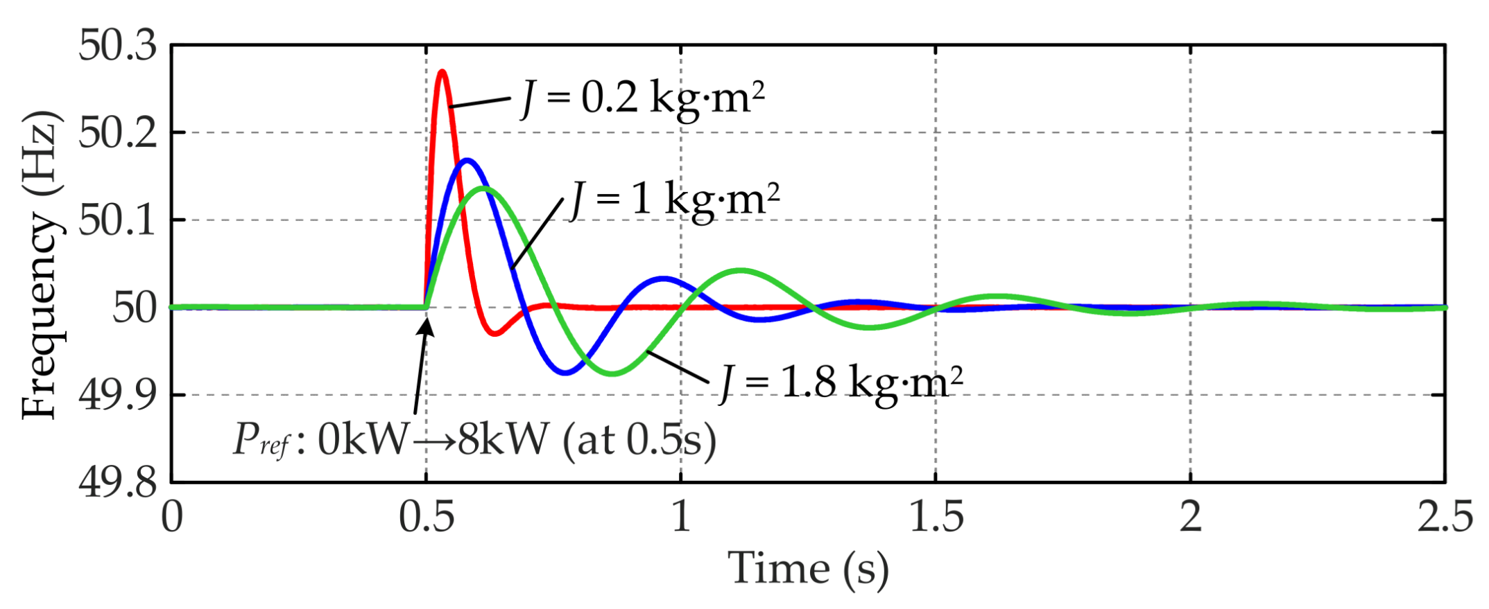 Figure 4, the proposed adaptive inertia and damping control strategy effectively responds to dynamic power fluctuations in the grid, enabling real-time adjustment of inertia and damping parameters. This control strategy ensures system stability, reduces overshoot, and enhances response speed.