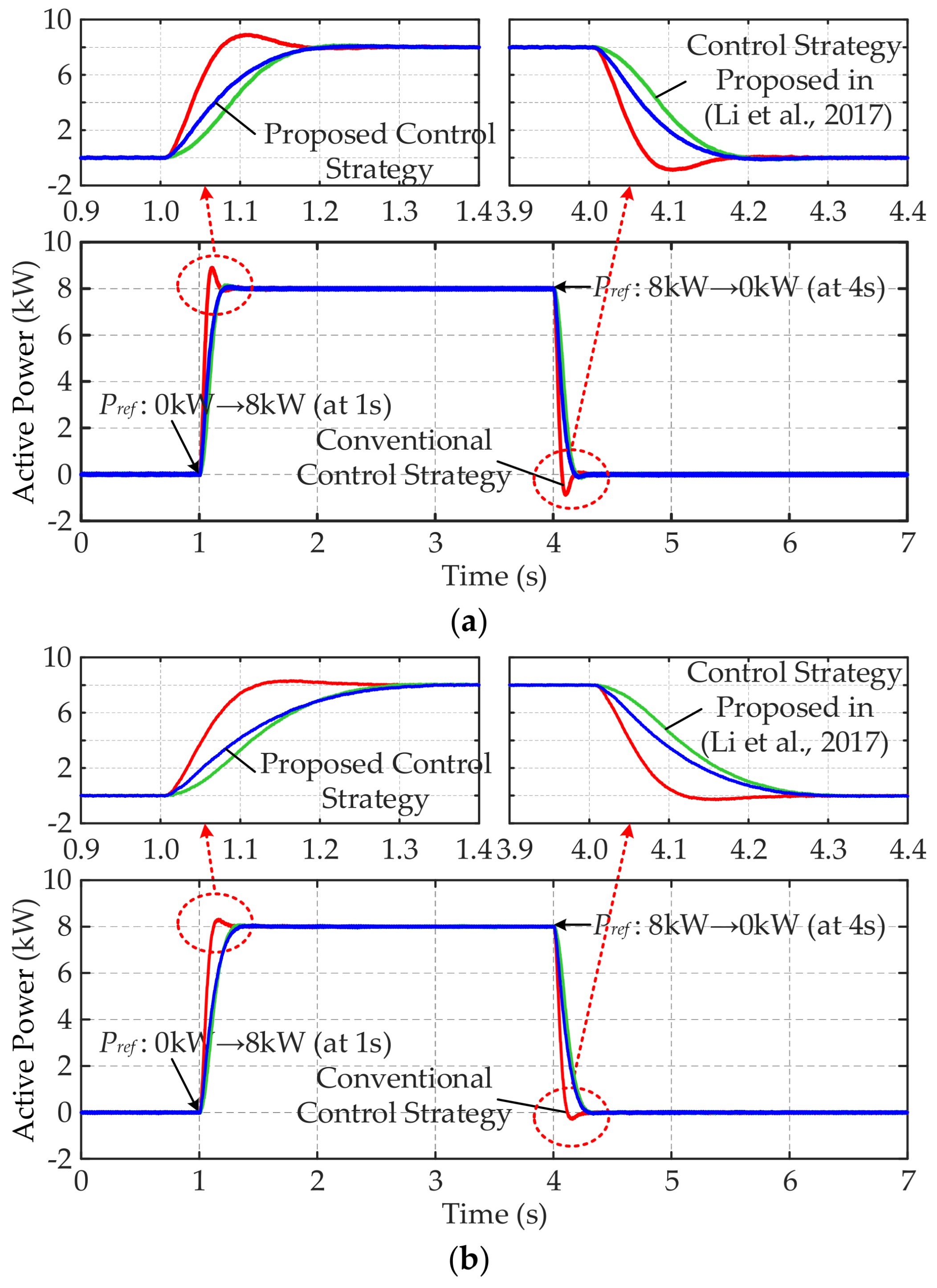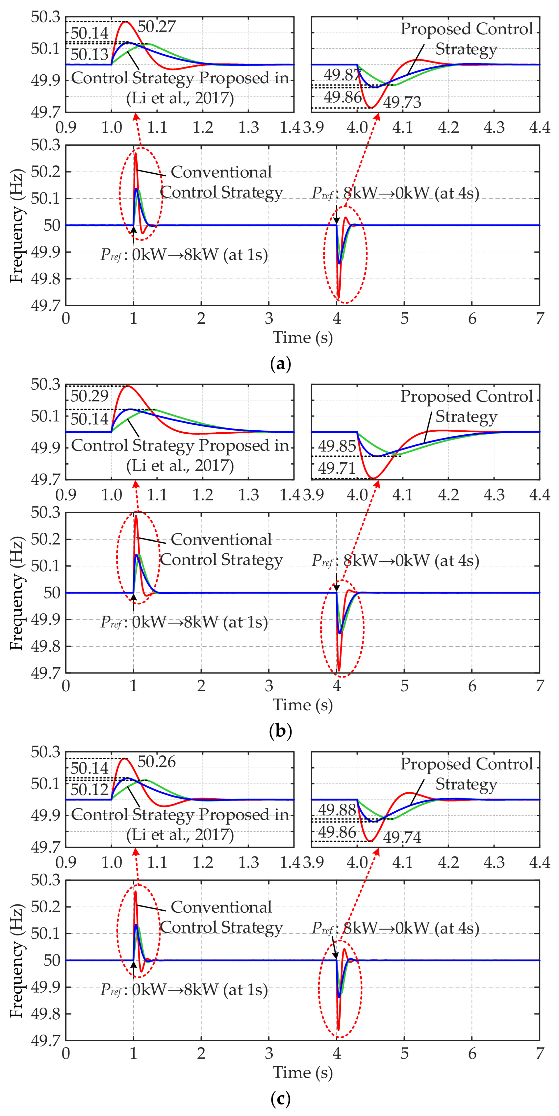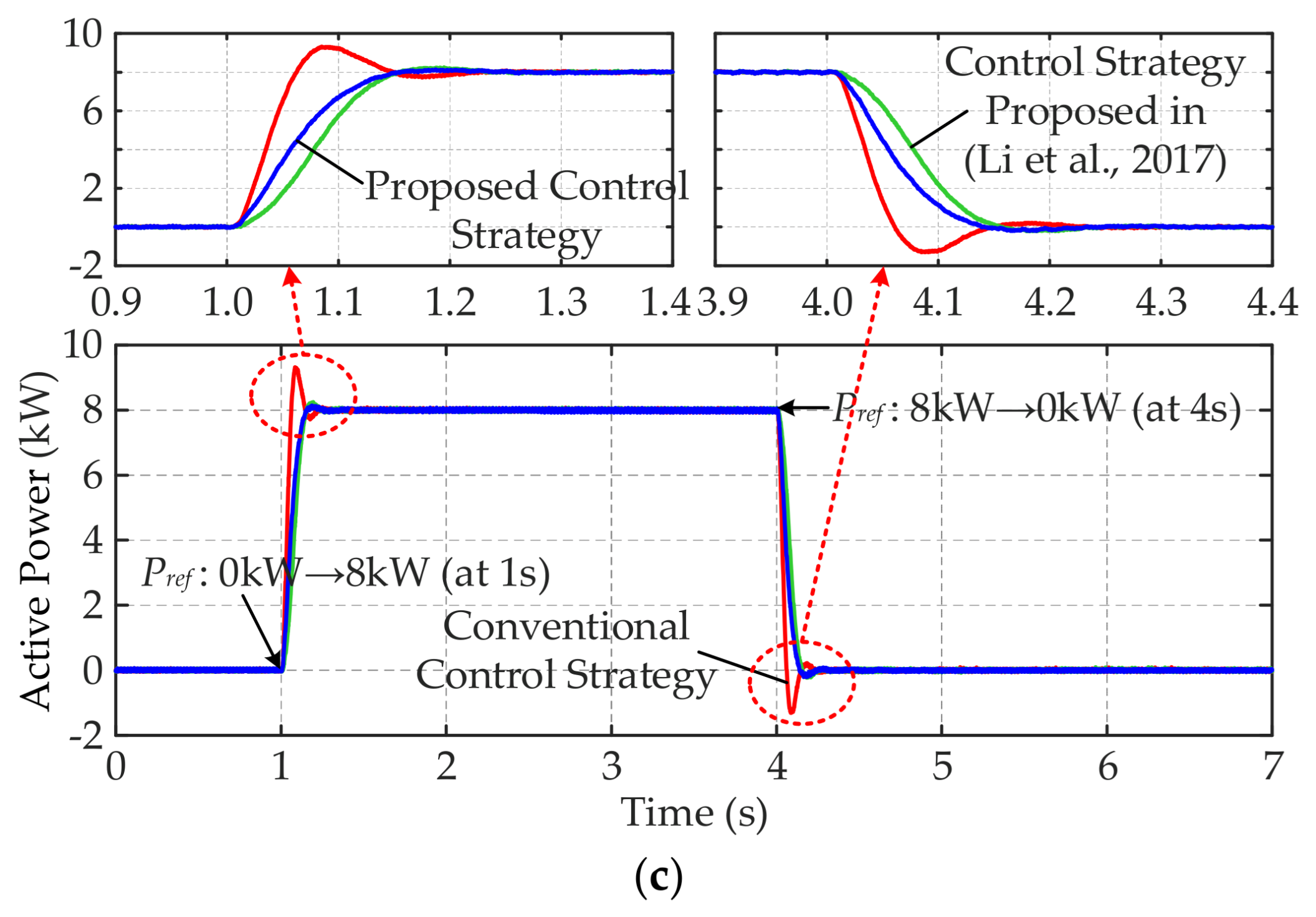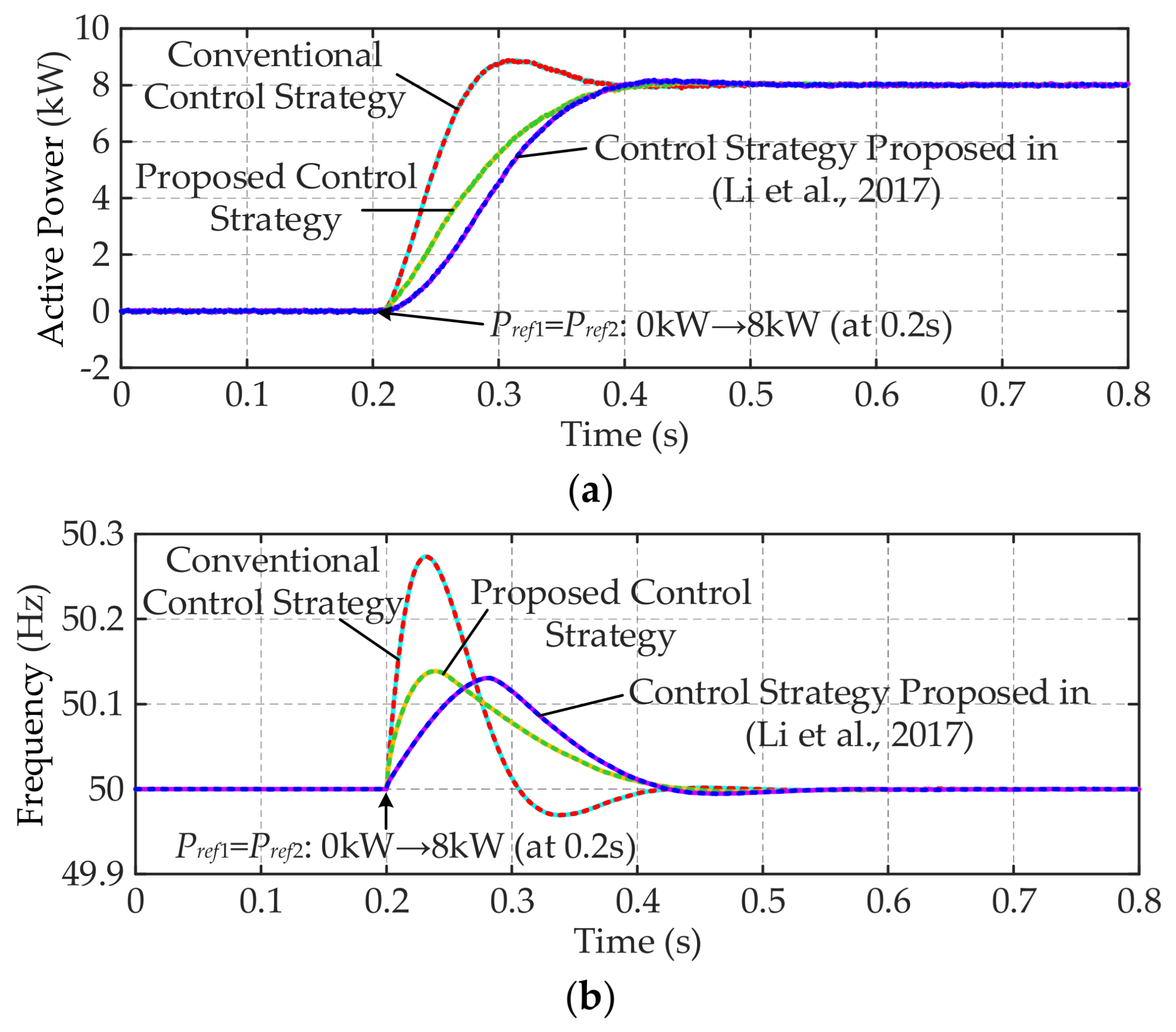 Figure 4, the proposed adaptive inertia and damping control strategy effectively responds to dynamic power fluctuations in the grid, enabling real-time adjustment of inertia and damping parameters. This control strategy ensures system stability, reduces overshoot, and enhances response speed.