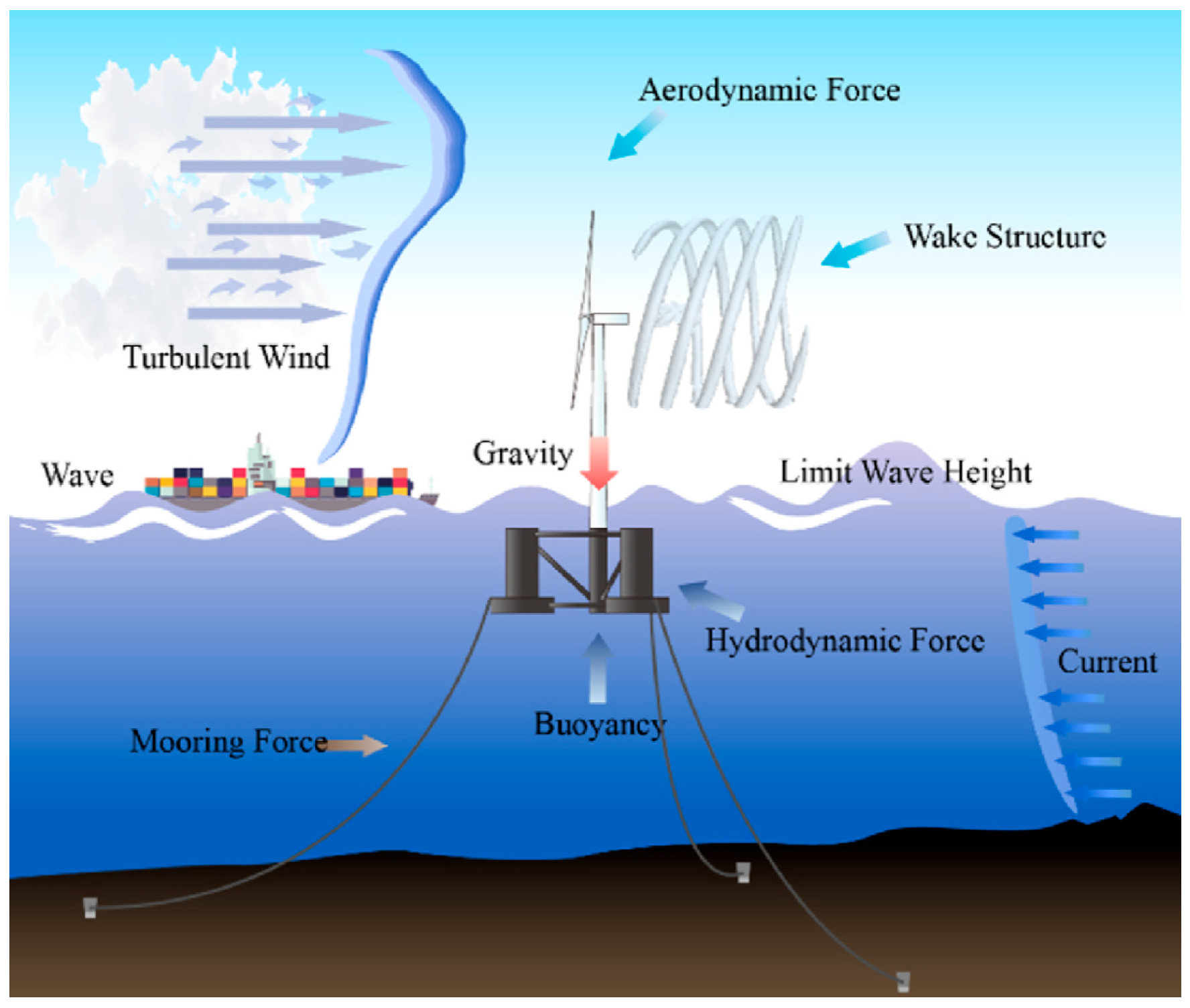 - Feng, X.; Fang, J.; Lin, Y.; Chen, B.; Li, D.; Liu, H.; Gu, Y. Coupled aero-hydro-mooring dynamic analysis of floating offshore wind turbine under blade pitch motion. Phys. Fluids 2023, 35, 045131. [Google Scholar]