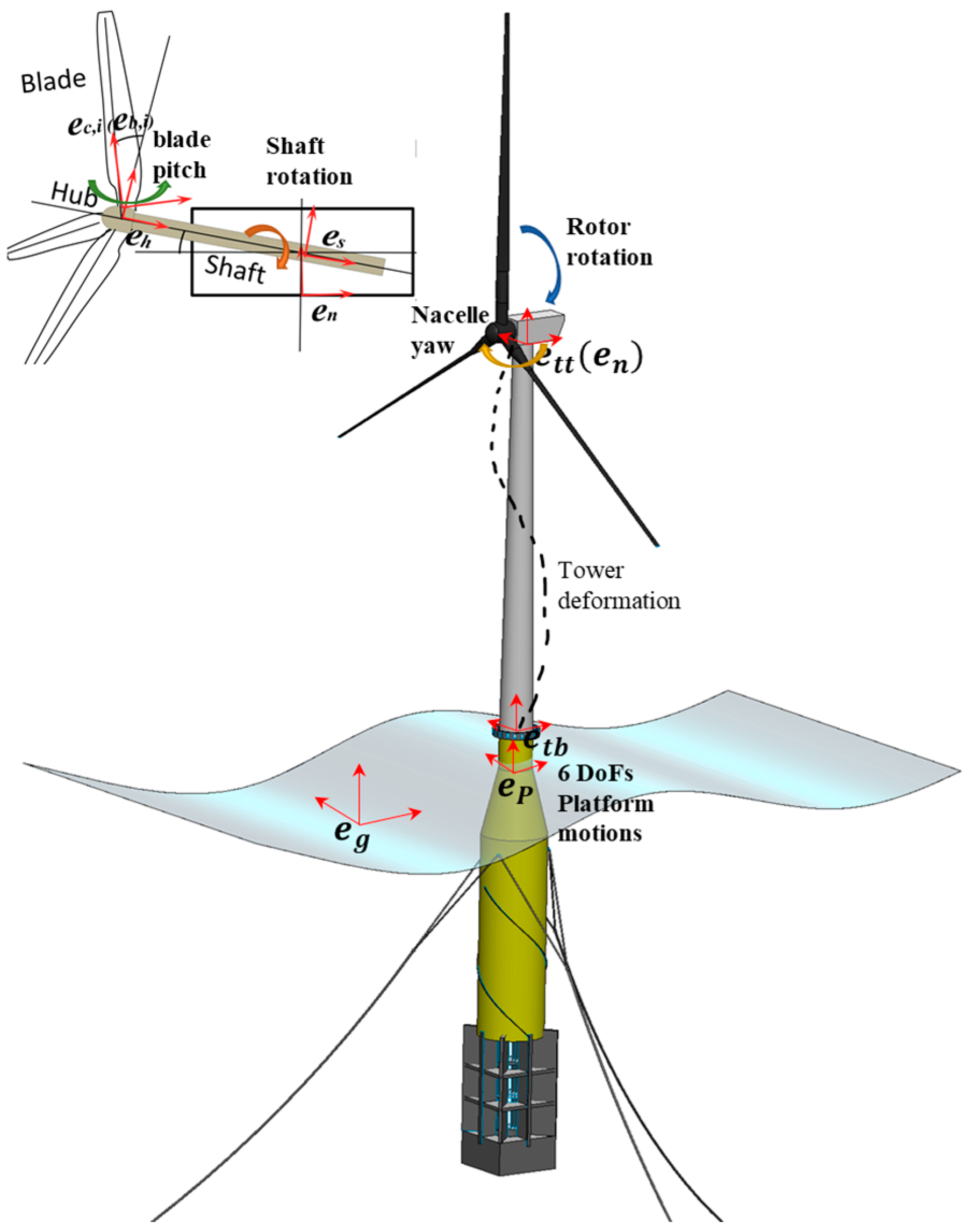 - Lee, H.; Lee, D.J. Effects of platform motions on aerodynamic performance and unsteady wake evolution of a floating offshore wind turbine. Renew. Energy 2019, 143, 9–23. [Google Scholar] [CrossRef]