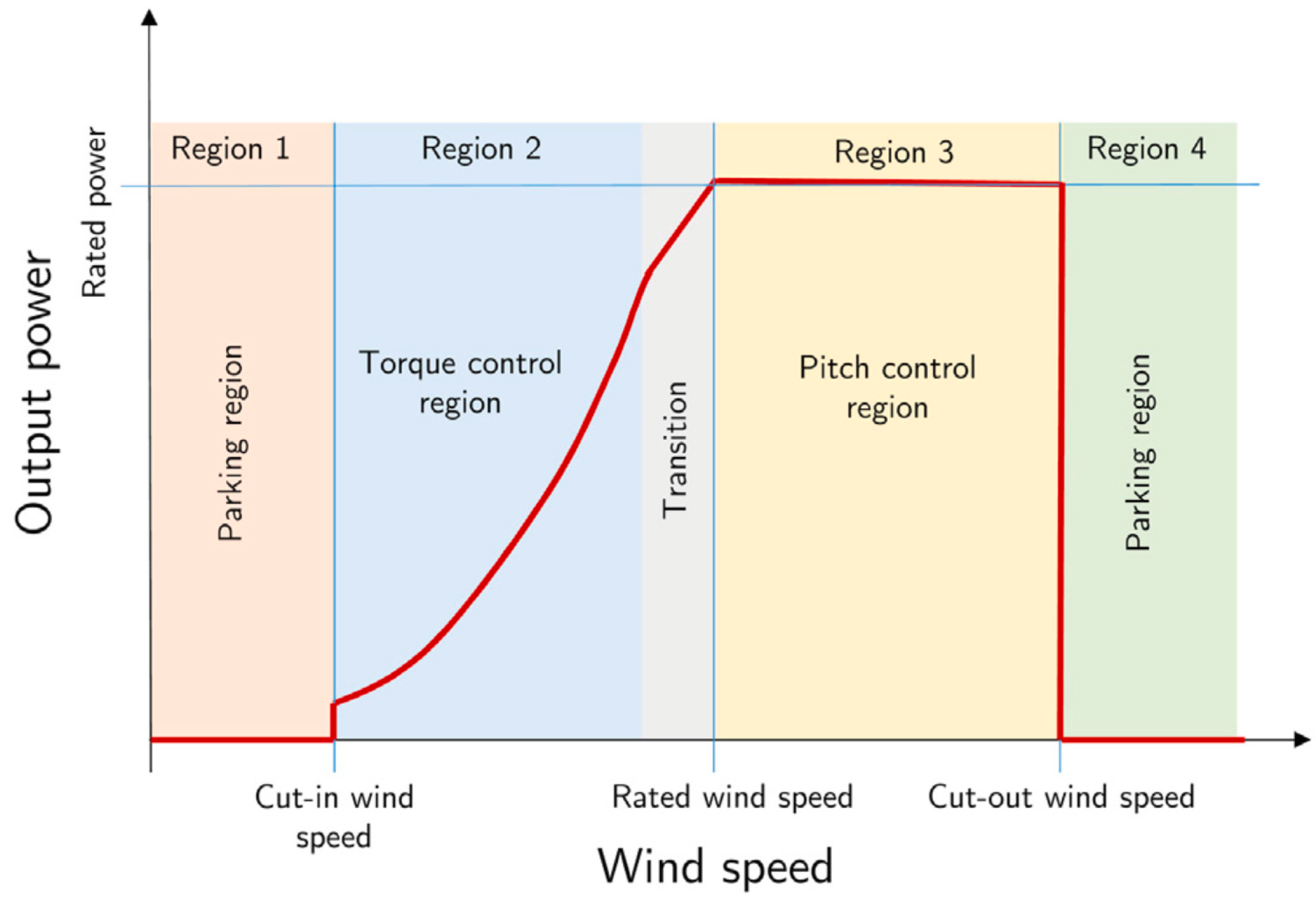 - Region 1: Wind speed is below cut-in; the turbine remains shut down as power generation is infeasible.